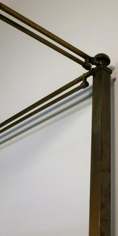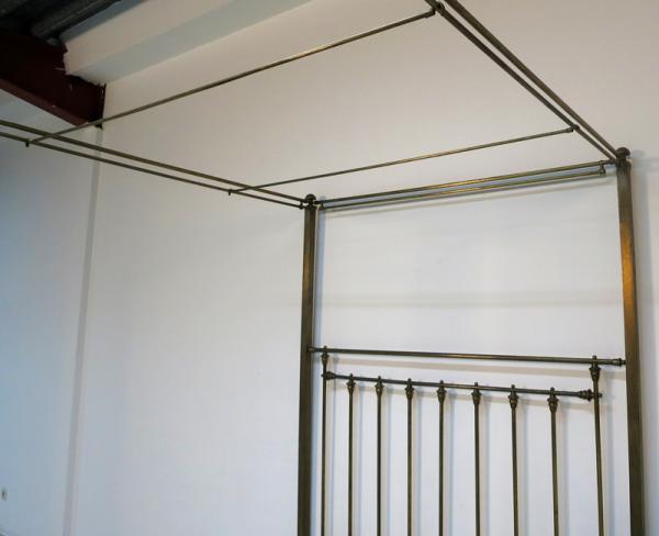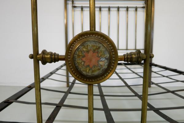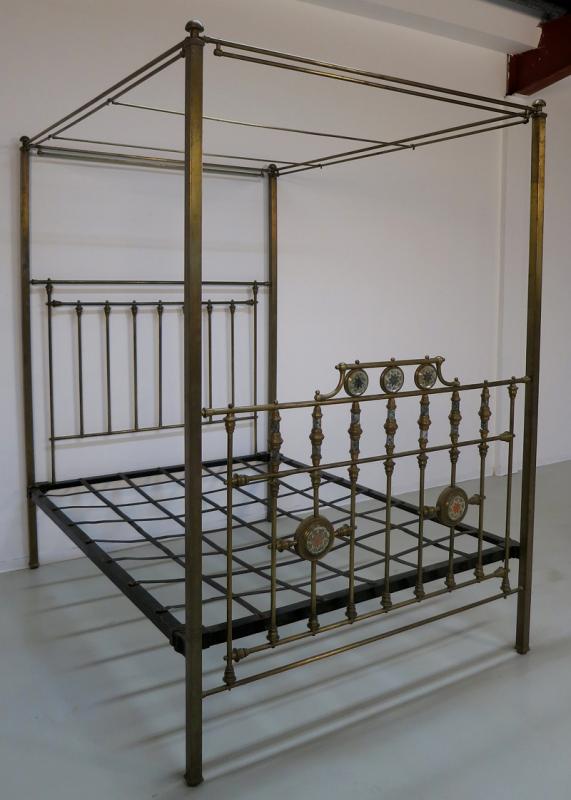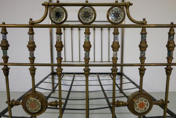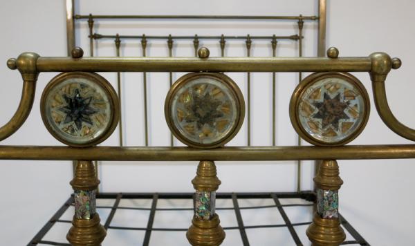 Der Korpus besteht komplett aus Messing und zeichnet sich durch seine filigran erscheinende und dennoch stabile Architektur aus. Am Himmel sind zur Anbringung feiner Vorhänge entsprechende Haltestangen angebracht, die vier kubischen Hauptstreben enden in abgerundeten Puppen. Das Kopfteil besteht ebenso wie das Fußteil aus einer klaren Anordnung von Streben, letzteres wird jedoch von fantastischen Perlmutteinlagen geschmückt. Insgesamt fünf kreisrunde Embleme mit sternförmiger Ornamentik in unterschiedlicher Farbgebung sowie 14 quadratische Formstücke in den oberen Streben zieren das Himmelbett auf meisterliche Weise.