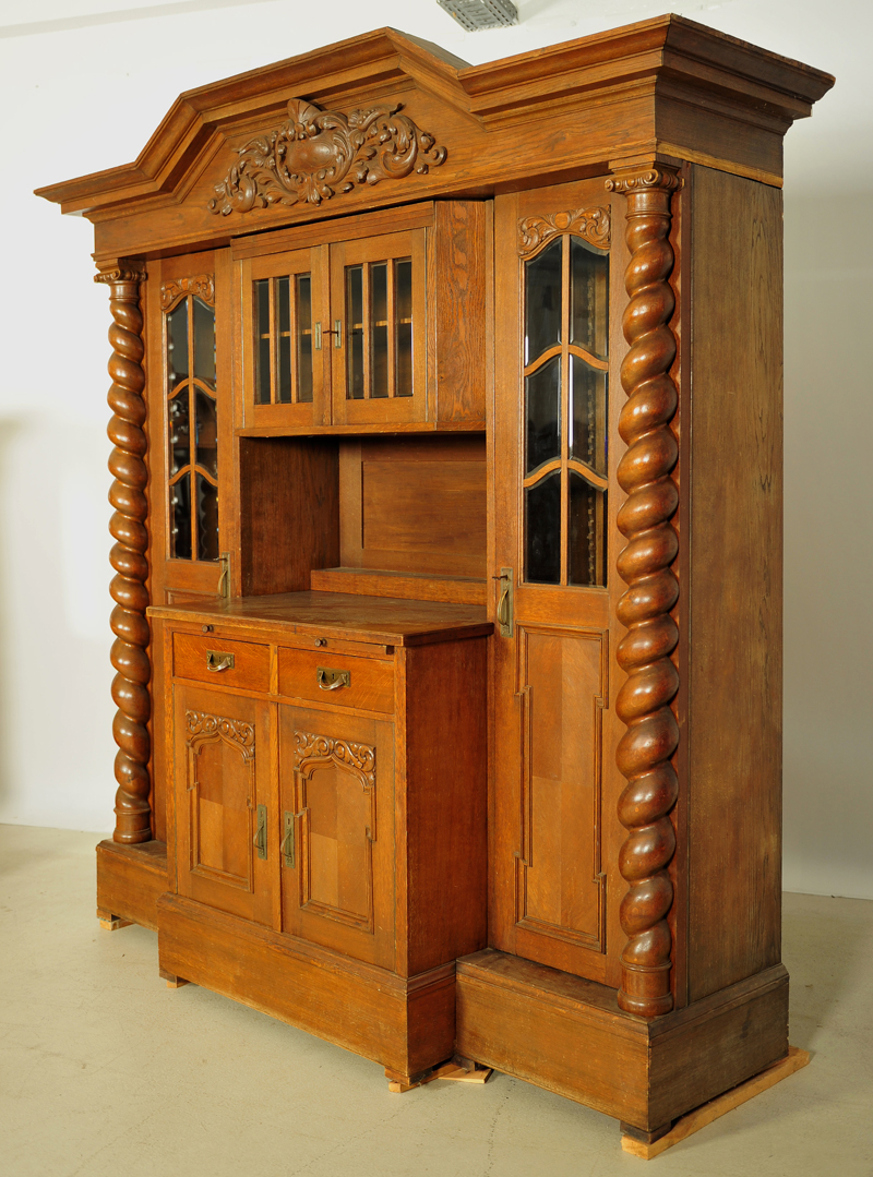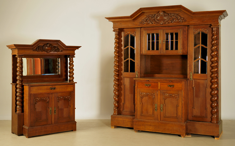 Es handelt sich dabei um zwei originale aus dem Danziger Barock, gefertigt um die Jahrhundertwende aus schönstem Eichenholz. Mannigfaltige Stilelemente machen aus diesen Möbeln einen einzigartigen Blickfang. Besonders hervorzuheben sind die monumentalen, reich profilierten und weit ausladenden Satteldächer mit unglaublicher mittiger Bekrönung. Diese sind kunstvoll geschnitzt, mit Muschelornamentik und geschneckten Blattranken versehen. Ebenso begeistern die fulminant dicken, gedrechselten Zopfsäulen mit aufwändigst gestalteten korinthische Kapitelle. Die Oberteile sind sehr schön gegliedert, die facettierten Scheiben des Buffets werden durch profilierte Zierleisten aufgewertet. Die Anrichte mit offenem Mittelteil ziert ein großer facettierter Spiegel. Die Unterteile sind mit abgesetzten kassettierten Türen und kleinen floralen Schnitzereien verziert. Die originalen Beschläge runden das elegante Erscheinungsbild der beiden Prunkstücke ab.