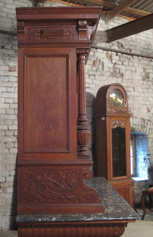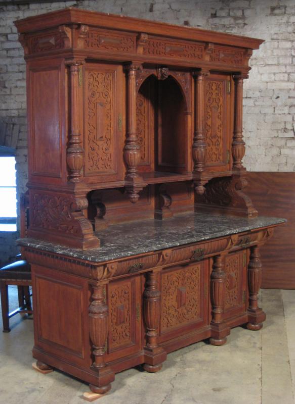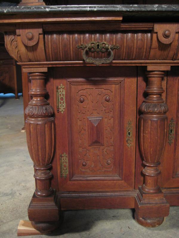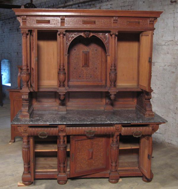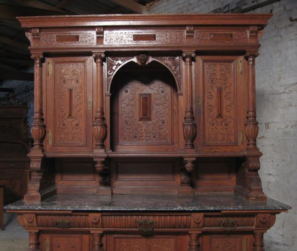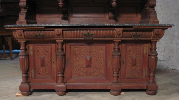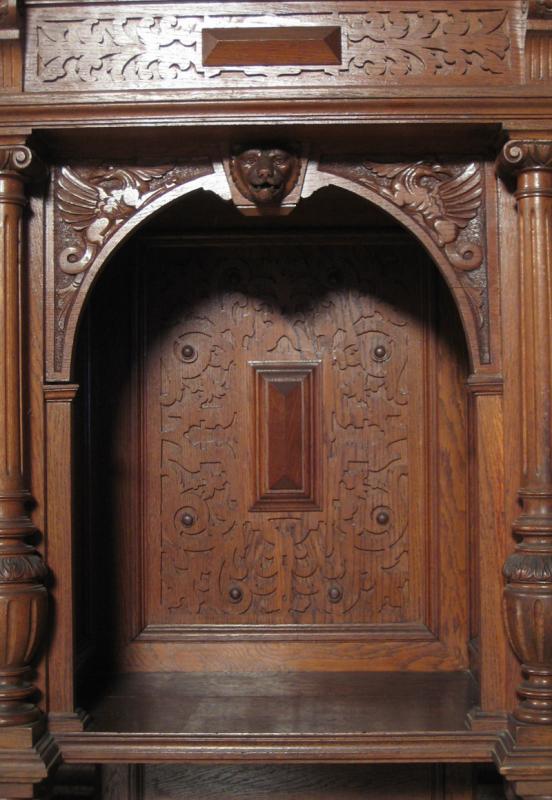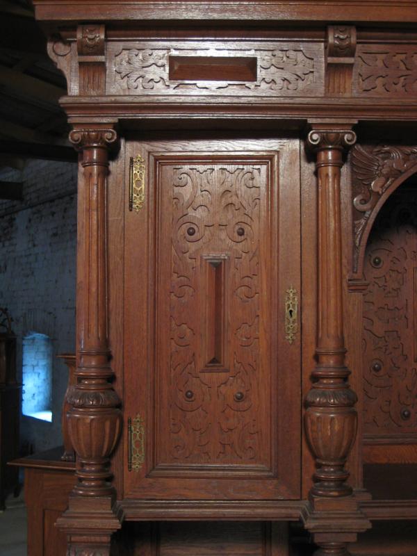 Zu seinen besonderen Merkmalen gehört das offene Mittelstück im Oberteil mit geschnitztem Rundbogen. In diesen wurden geflügelte Drachen ein- und ein grandioser Löwenkopf herausgeschnitzt. Im Hintergrund erhebt sich über einer mit Blattranken filigran verzierten Füllung eine breite und profilierte Diamantierung. Dieses Stilelement findet sich in nahezu jedem Abschnitt des Möbel wieder.Weiterhin hervorstechend sind die fantastischen Balustersäulen, die mit schmalen kannelierten oder bauchigen Teilstücken und geschneckten Kapitellen begeistern, die durchgängig verschnitzten Wangen des Mittelstücks, die auf einer wunderschönen Marmoplatte ruhen sowie die originalen und aufwändig gefertigten Beschläge.