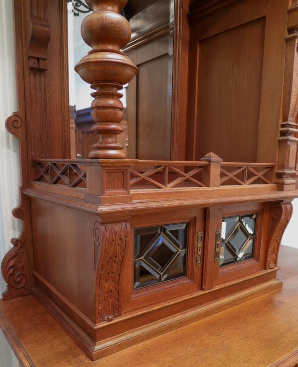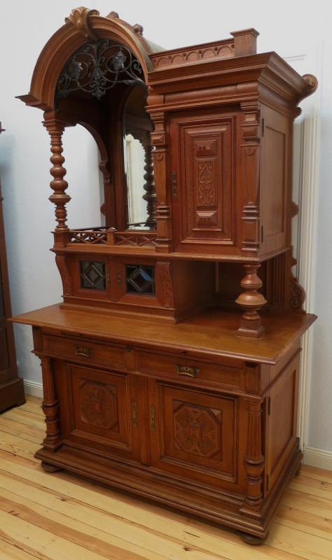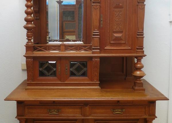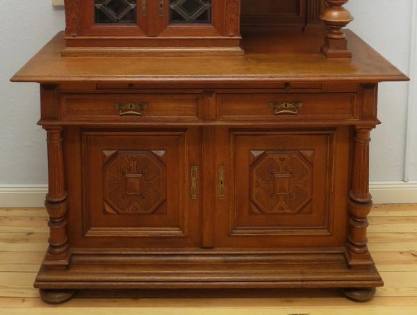 Hier sehen Sie ganz spezielles, original Berliner Gründerzeit Büffet, das um die Jahrhundertwende aus bester Eiche, massiv und furniert, gefertigt wurde. Seine außergewöhnliche, asymetrische Gliederung sowie die wunderbaren Details in meisterlicher Qualität begründen seine überaus repräsentative Ausstrahlung.