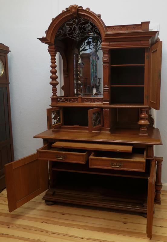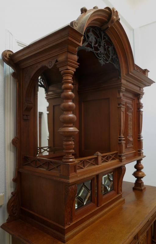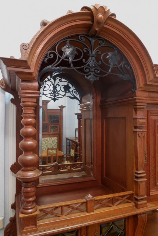 Der reich gegliederte Aufbau ist voller herausragender Alleinstellungsmerkmale. Der mehrfach profilierten Rundgiebel beeindruckt mit kleiner geschnitzter Bekrönung und einem fantastischen, handgeschmiedetem Zierwerk, die darunter liegende offene Seite wird von einer fulminant gedrechselten Säule gestützt und von zwei Seiten von Balustraden, einer volutierender Flanke und einem Pilaster eingerahmt. Im Hintergrund ist ein großer, facettierter Spiegel eingesetzt. Unterhalb befinden sich zwei kleine, bleiverglaste Türen. Rechter Hand liegt der Schrankteil mit kassettierter und beschnitzter Türfüllung, er stützt sich auf eine massive Vollsäule.