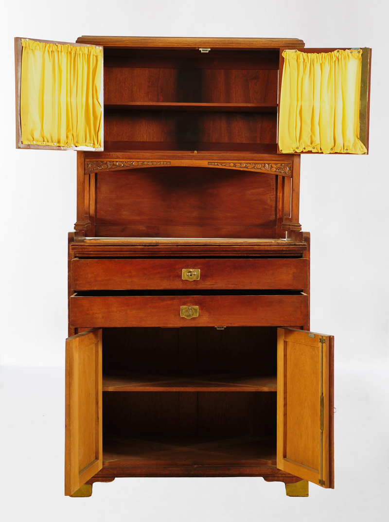 Besonders erwähnenswert sind die kunstvollen Schnitzereien in Form von Blättern im oberen Teil des Buffets, die komplette Kassettierung des Unterteils, die beiden praktischen Schübe sowie die originalen Beschläge.