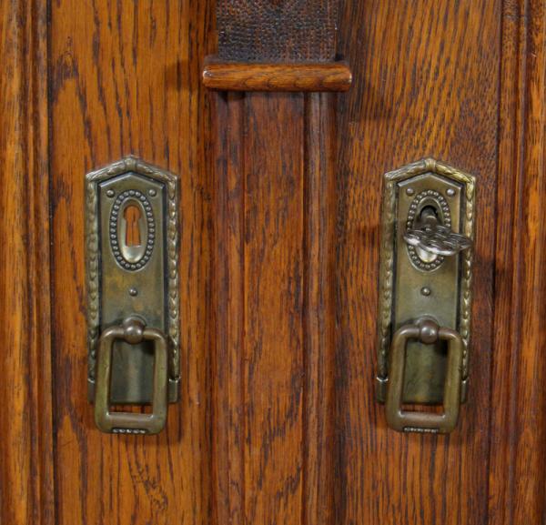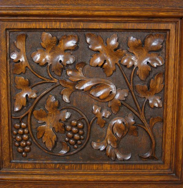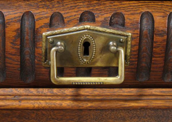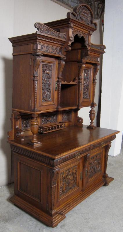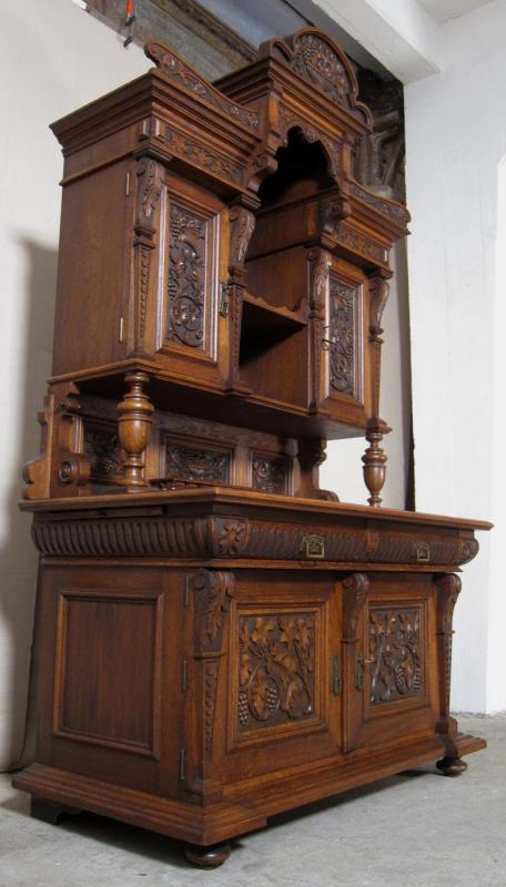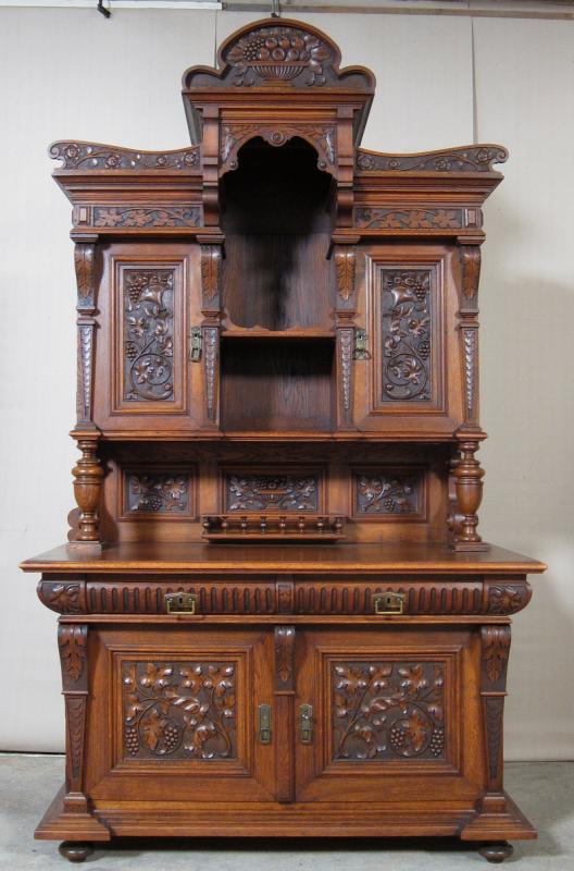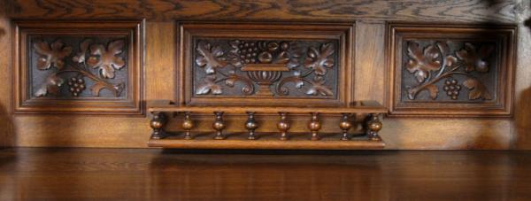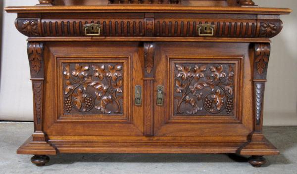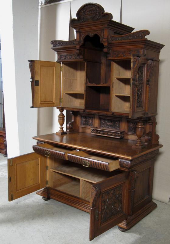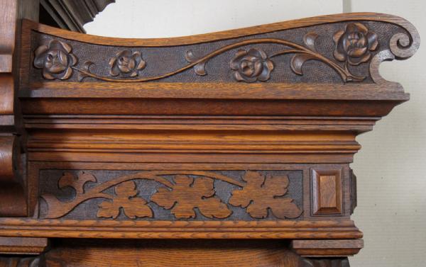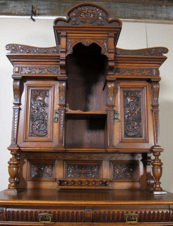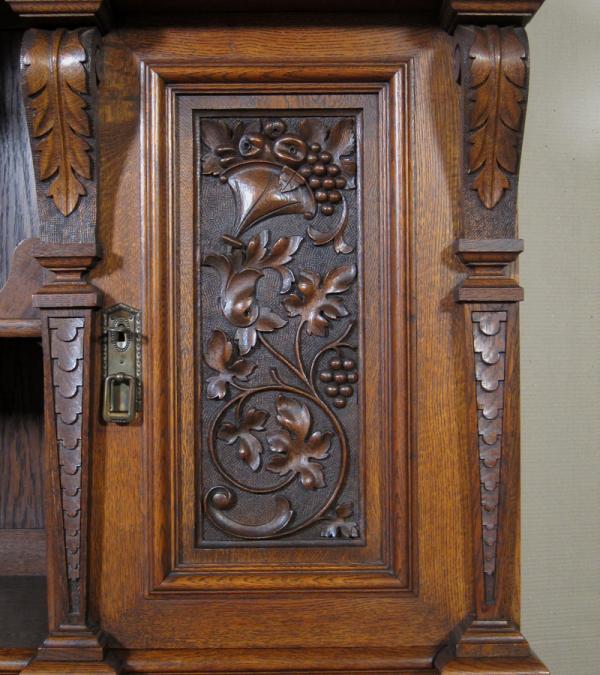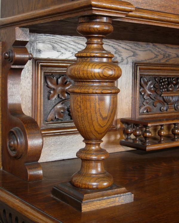 Besonders erwähnenswert sind die fulminante Krone mit geschnitzten Früchten, die unglaublichen Türfüllungen und Kassettierungen mit eindrucksvoller Ornamentik, die kleine Galerie oberhalb der Platte, das offene Mittelstücke des Oberteils, die verzierten Pilaster mit Schuppenfries und applizierten Akanthusblättern, die gedrechselten Balustersäulen im Mittelteil, die breit kannelierten Schübe sowie die grandiosen Beschläge.