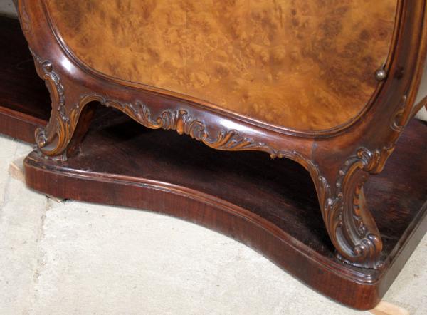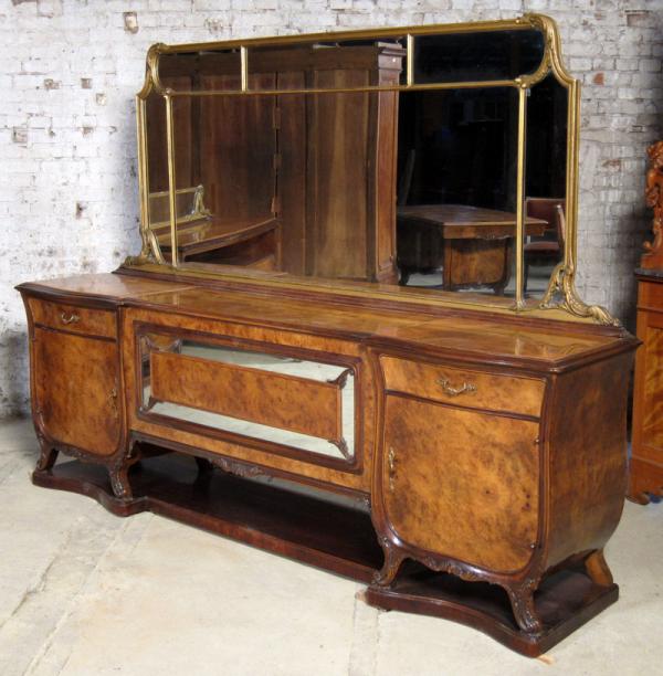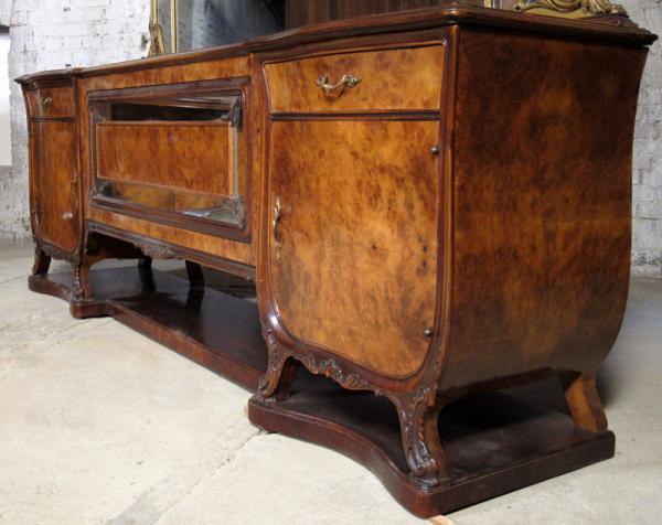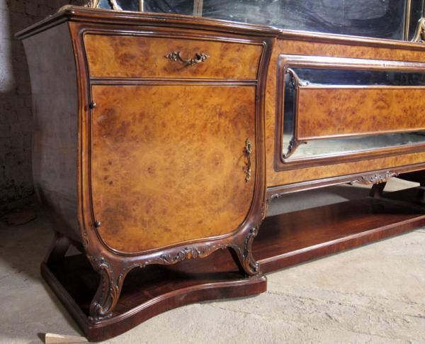 Besonders hervorzuheben sind die glänzend polierten Flächen in leicht schwungvoller Geometrie, der kunstvolle, riesige Spiegelaufsatz mit vergoldetem und schön geschnitztem Rahmen, das extravagante Mittelstück mit eingesetztem Spiegel, das hochwertig gegenfurnierte Innenleben mit zwei Schubläden, Einlegeböden und mittiger Klappe, die originalen Beschläge sowie die detailiert geschnitzten Füße. Beachten Sie bitte auch die zu diesem Büffet gehörende kleinere Anrichte im letzten Bild, die wir für Sie in einer anderen Auktion anbieten.