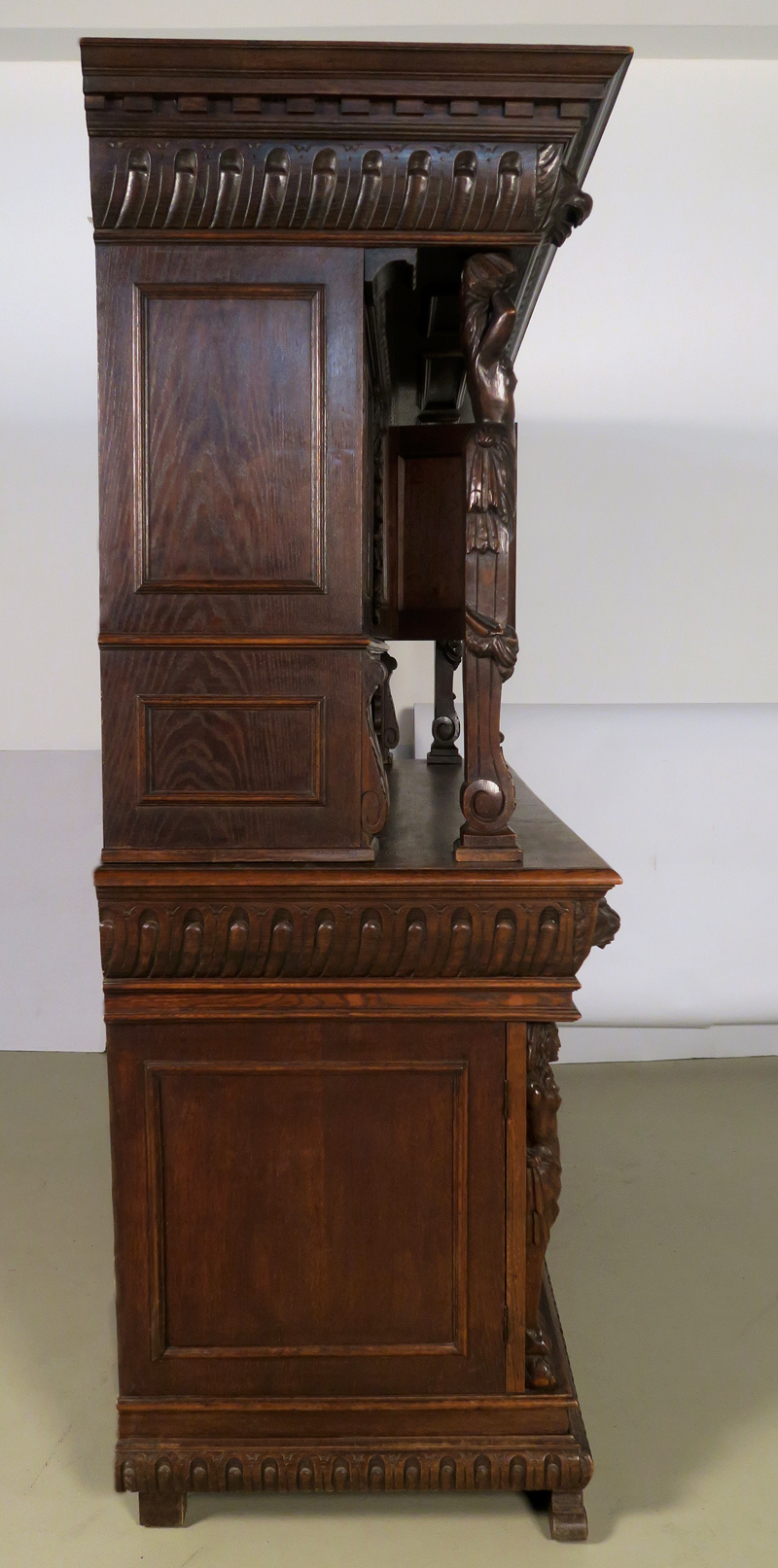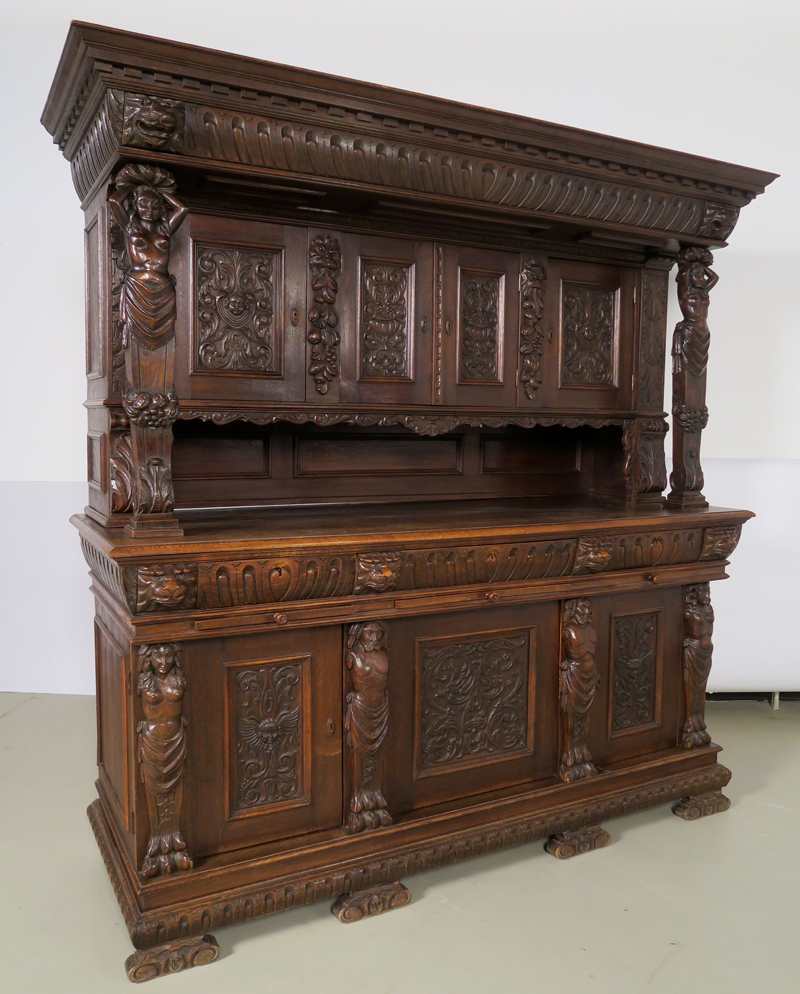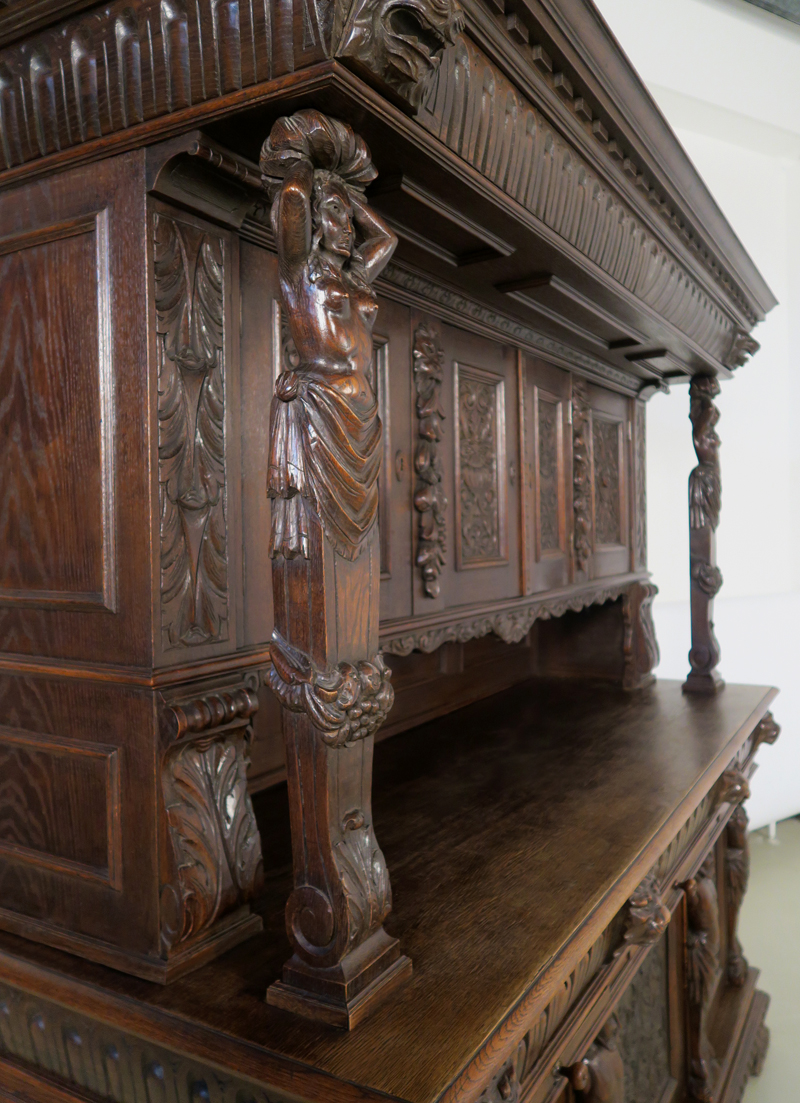 Heute dürfen wir Ihnen wieder einmal ein außergewöhnliches Zeugnis handwerklicher Tischlerkunst anbieten, das in seiner Architektur und filigraner Gestaltung überwältigend ist. Es handelt sich dabei um ein exquisites Prunkbüffet aus der Gründerzeit, gefertigt um die Jahrhundertwende aus feinster Eiche, massiv und furniert.