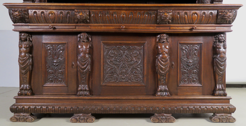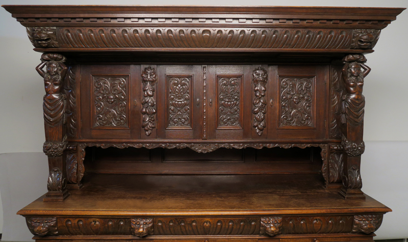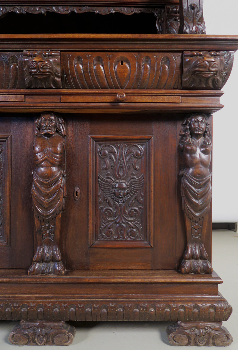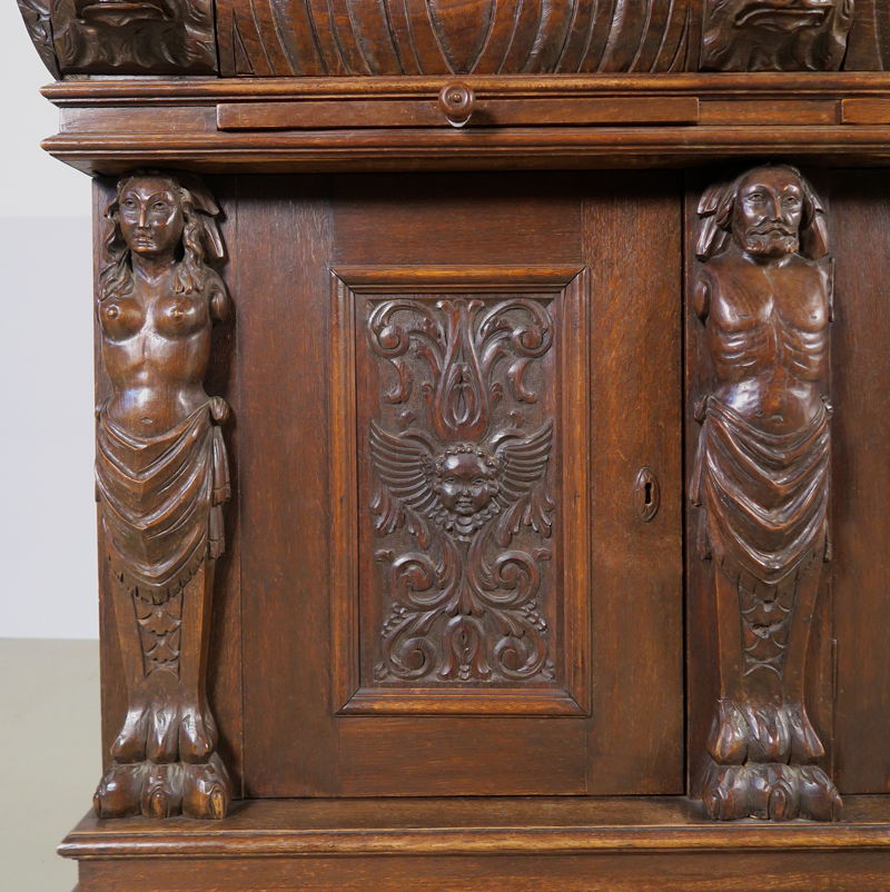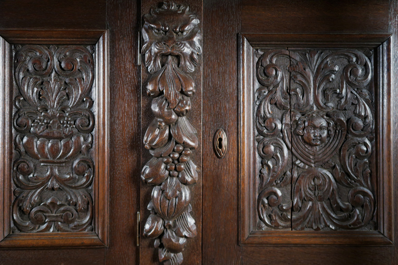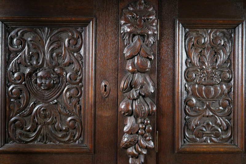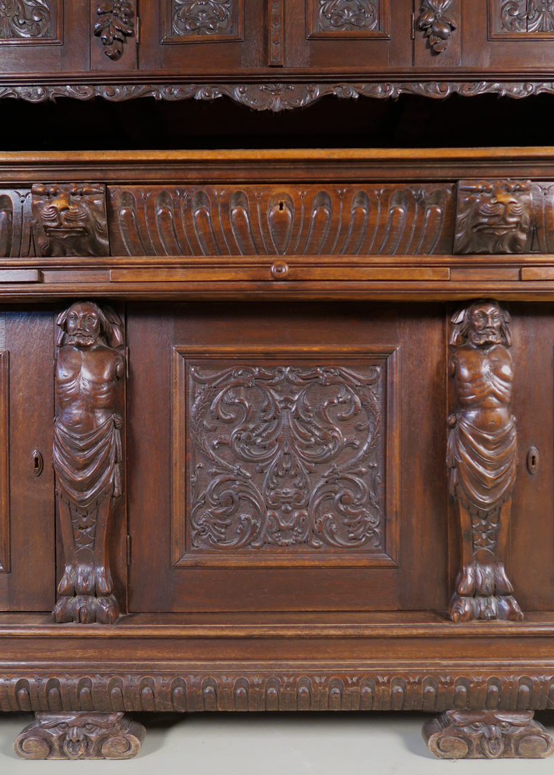 Das Unterteil wird von vier plastischen Figuren beherrscht, die Türfüllungen sind ebenso grandios. Verschlungene Blattranken, Löwenköpfe, eindrucksvolle, fratzenhafte Gesichter runden das überwältigende Kunstwerk stilvoll ab.