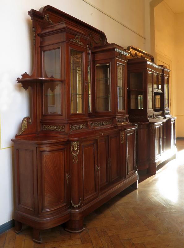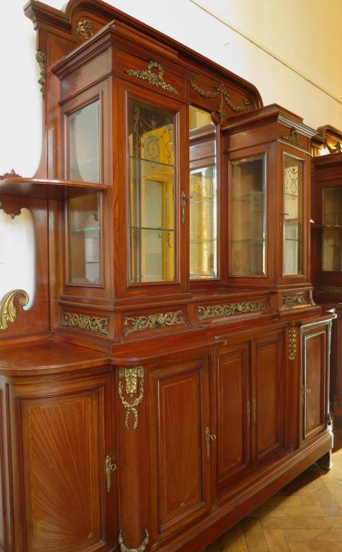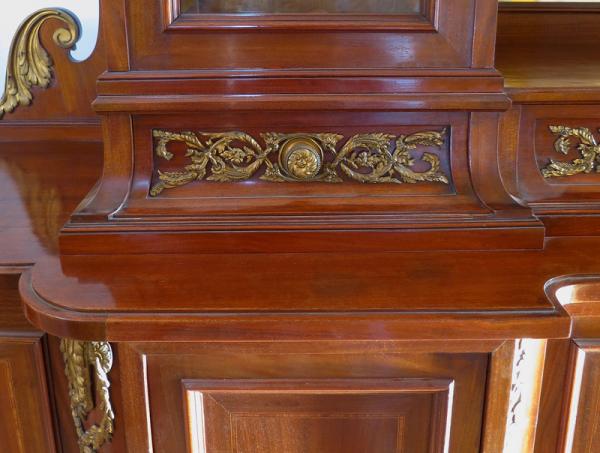 Hervorzuheben sind die facettierten und ornamierten Scheiben der Vitrinentürme und der Spiegel, das wundervolle Beschlagwerk aus Bronze mit traumhaften floralen und herrschaftlichen Elementen, die profilierten Kassettierungen, die gewölbten Flanken sowie das fantastische Furnierbild mit intensiver Maserung in warmem Farbton.