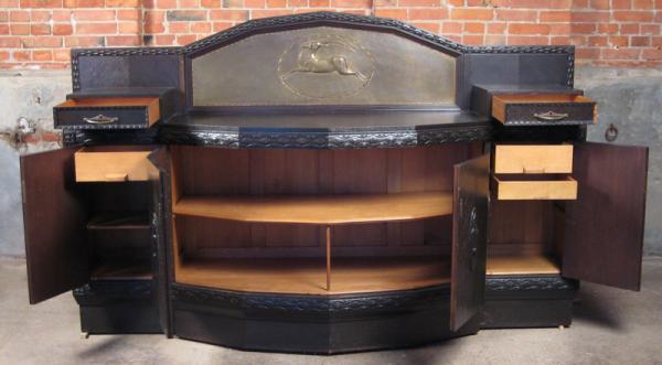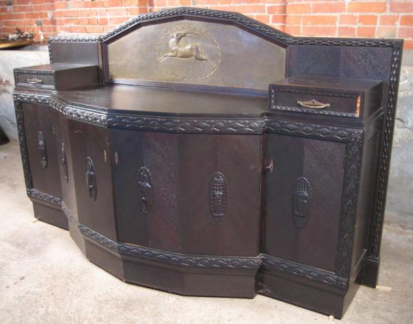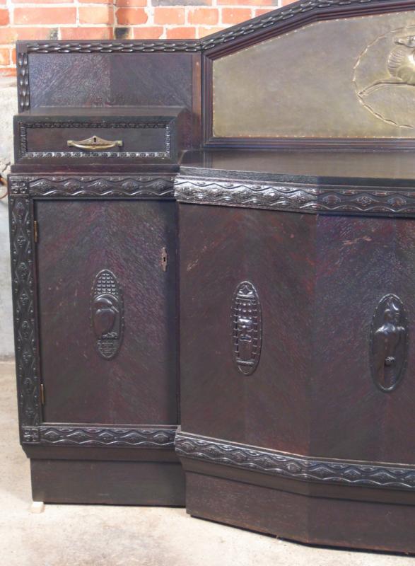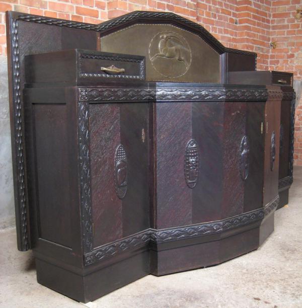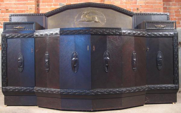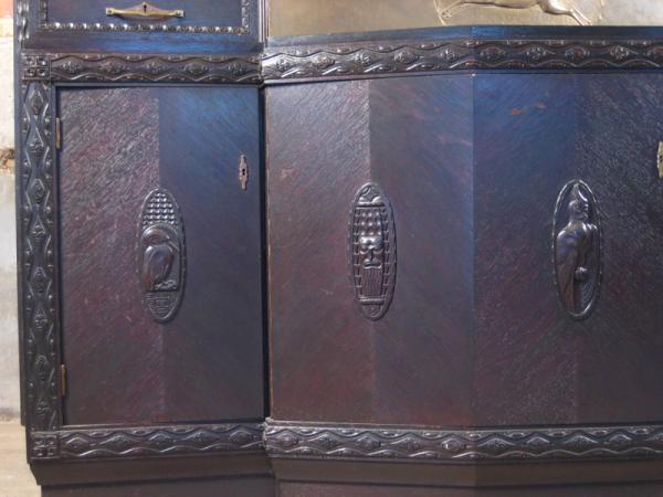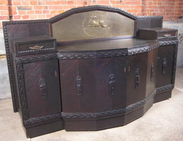 Heute offerieren wir Ihnen einen ganz außergewöhnlichen Entwurf des Art Deko. Es handelt sich hierbei um eine Prunkkredenz aus ebonisiertem Eichenholz und ist wohl ein Darmstädter Entwurf aus der Schule des berühmten Architekten Peter Behrens. Sie wurde laut Vorbesitzer für ein Schloss bei Düsseldorf entworfen. Gefertigt um 1920 besticht diese Anrichte durch ihre markante Form und wuchtigen Proportionen. Ausgestattet mit kolonialen Symbolen ist sie eine wahre Rarität dieser Kunstepoche!!!