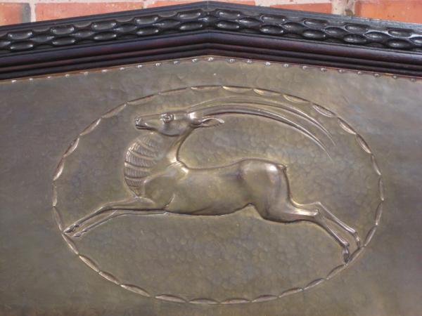 Die Besonderheiten im Einzelnen: wahnsinniges Bronzerelief, eine im Sprung befindliche Gazelle darstellend, im Aufsatz, originale, formschöne Bronzebeschläge und Bronzeriffe an Schubladen und Türen, sechs geschnitzte Applikationen mit Wildvögeln und maskenhaften Gesichtern an den Türen, vertikal und horizontal verlaufende sehr aufwändig gestaltete Pilaster sowie die sagenhafte, nie gesehene, fünfeckig hervorspringende Form des Mittelteils!