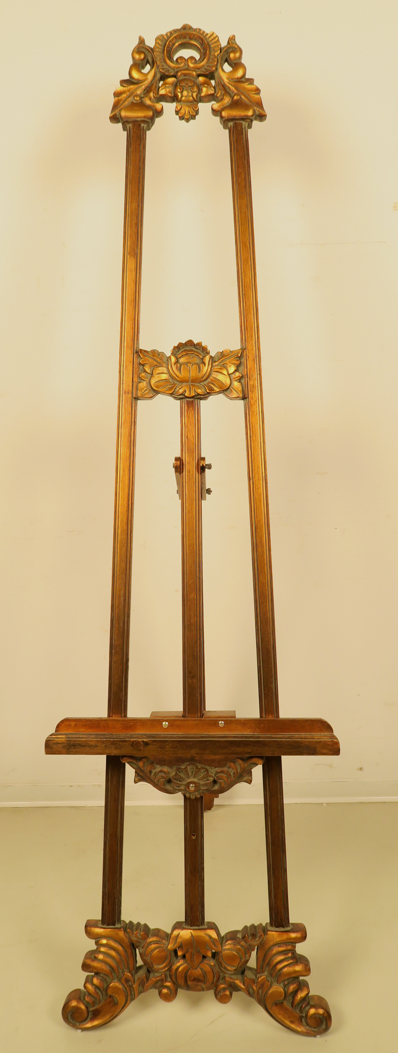 Die wunderschöne goldbronzierte Staffelei überzeugt mit seiner schönen floralen Schnitzerei mit Blumen und Blattranken.