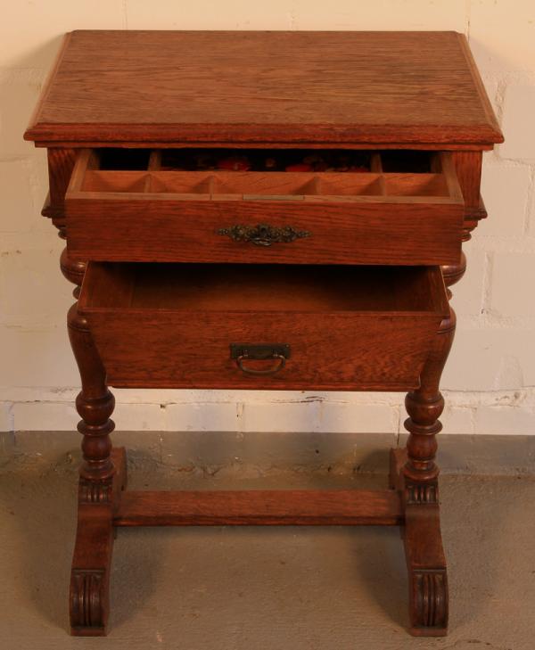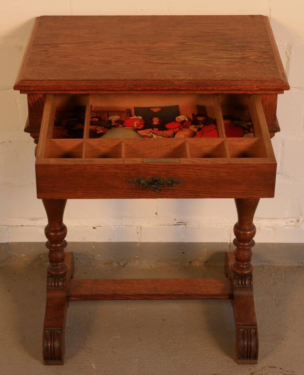 Das Nähkästchen ist in gutem Originalzustand mit altersbedingten Gebrauchsspuren.