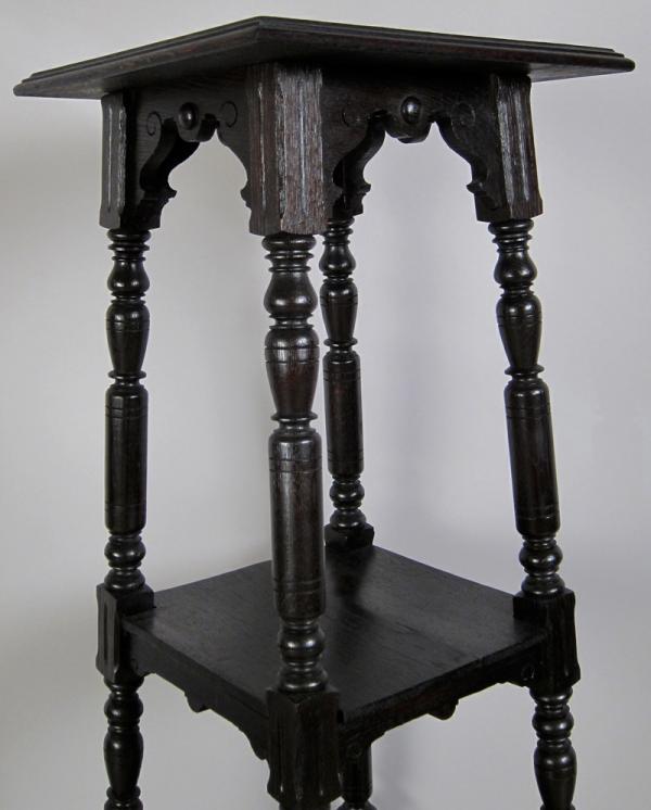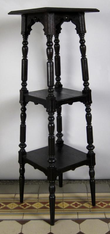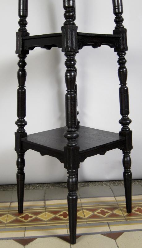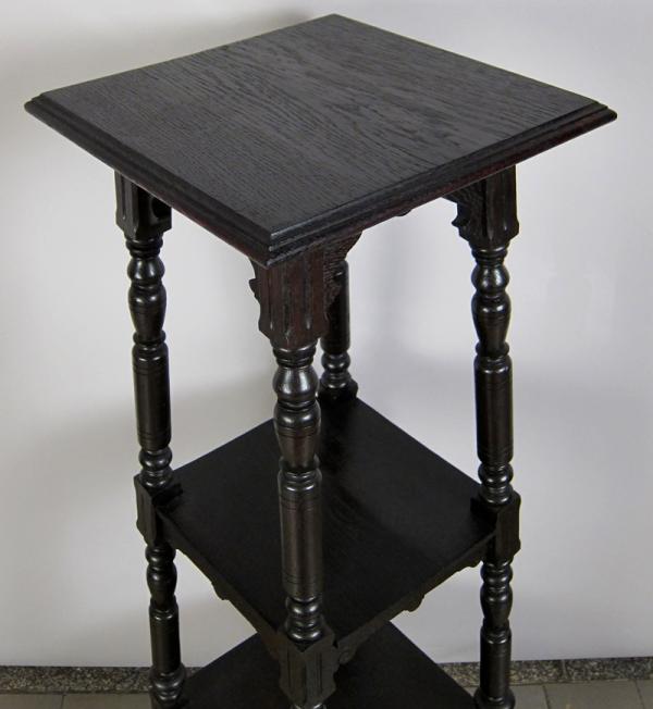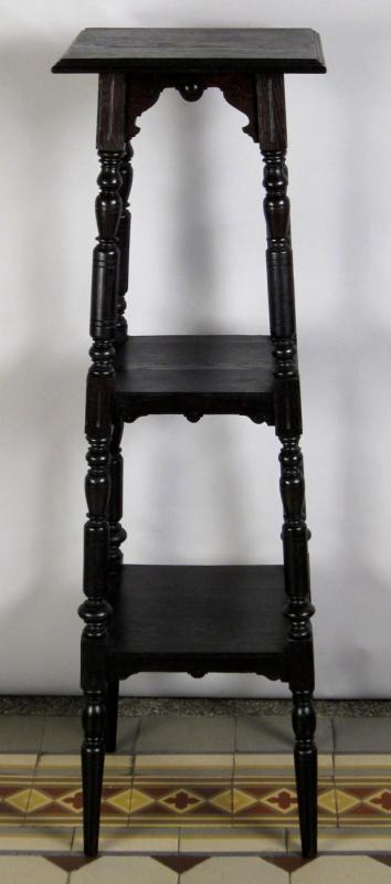 Das ebonisierte Nussbaum zeigt sich in seinen vier massiven, fein gedrechselten Beinen und den drei leicht verzierten Ablagen von seiner schönsten Seite. Das Exponat eignet sich durch seine Höhe und Abmaße sehr schön als Beistell- oder Pflanzentischchen.
