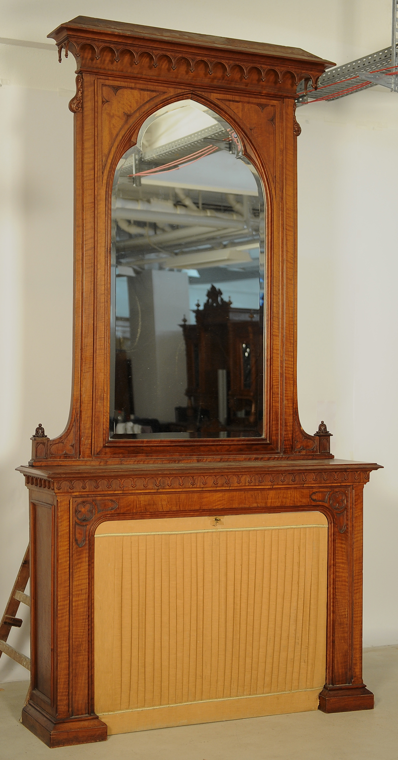 Der gotische Stil zeichnet die imposante Charakteristika dieses Möbels aus, verstärkt wird dieser Eindruck noch durch ihre großen Patina. Das Oberteil wird bestimmt durch den am Gesims umlaufenden Rundbogenfries, die seitlichen Pilaster mit geschnitzten Kapitellen und die mehrfach profilierte Kassettierung des facettierten Spiegels in Form eines Spitzbogens. Das Unterteil weist ebenfalls ein, etwas kleineres, Rundbogenfries sowie die eingeschnitzten Elemente in floraler Optik auf. Eine Besonderheit ist der das Innenleben verdeckende und mehrfach geteilete Vorhang aus beigem, schwerem Stoff.