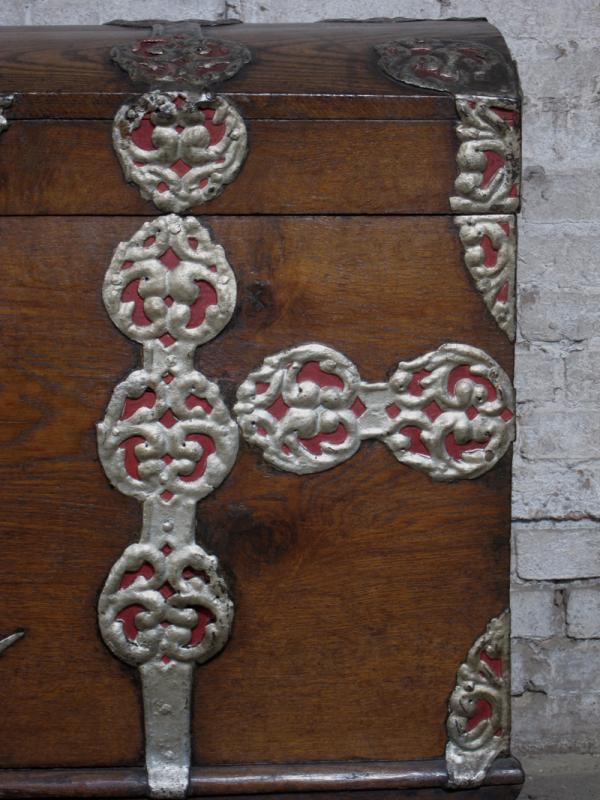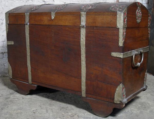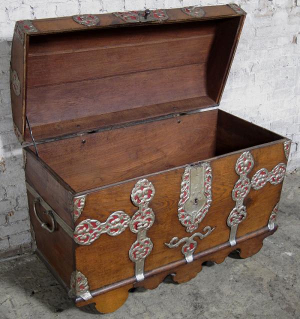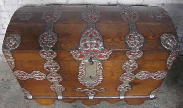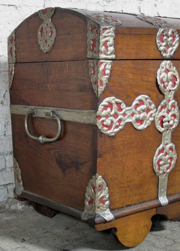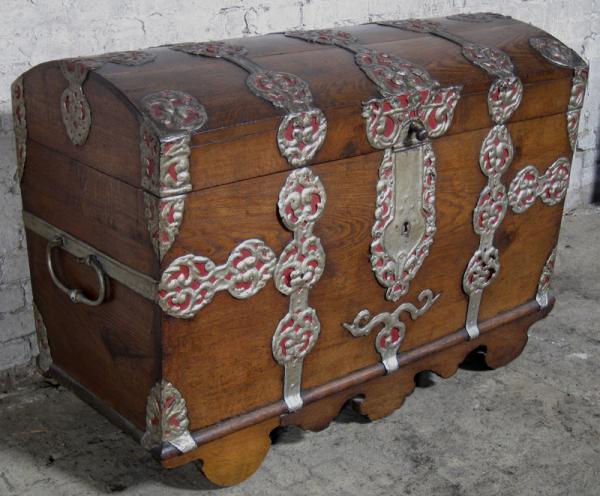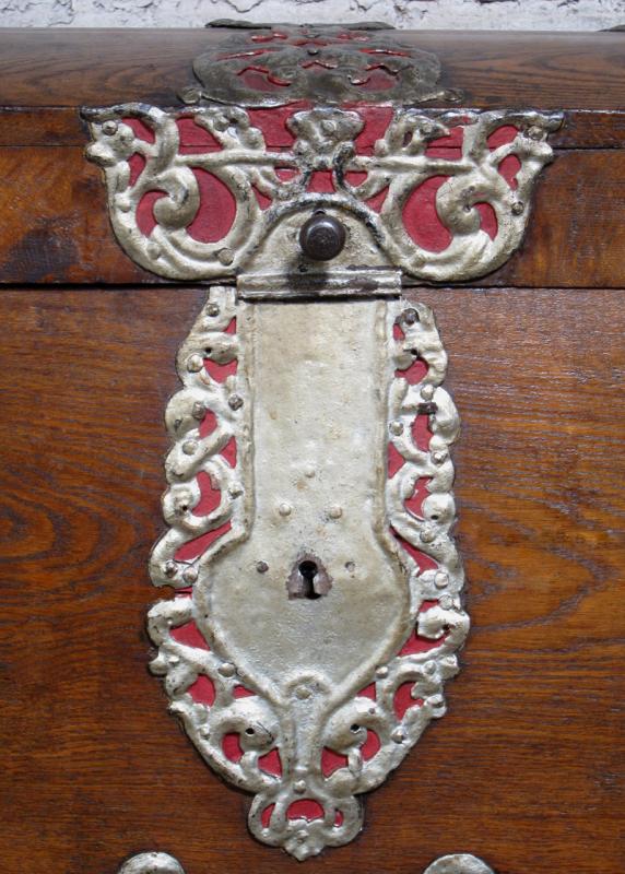 Besonders die prunkvollen riesigen Metallbeschläge in schwerer Ausführung und doch zierlich eingearbeiteten Details rufen Bilder längst vergangener Zeiten hervor. Das vom Alter deutlich gezeichnete Holz mit uriger Maserung und Farbnuance unterstützt diesen Eindruck noch.