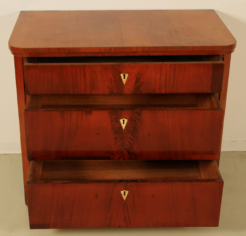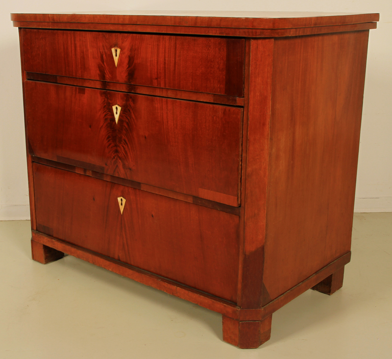 Hier bieten wir Ihnen eine original Biedermeier-Kommode, die um 1830/40 aus feinstem Pyramidenmahagoni, massiv und furniert gefertigt wurde. Ihre edle Gestaltung und elegante Ausstrahlung sind auf jeden Fall meisterlich!
