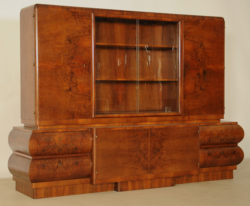 Hier bieten Sie auf einen höchst interessanten Entwurf des Art Deco an. Dieser einzigartige Bücherschrank wurde um 1920 aus kaukasischem Nussbaum, massiv und furniert, gefertigt und überzeugt durch sein extravagantes Design kombiniert mit hervorragender handwerklicher Qualität.