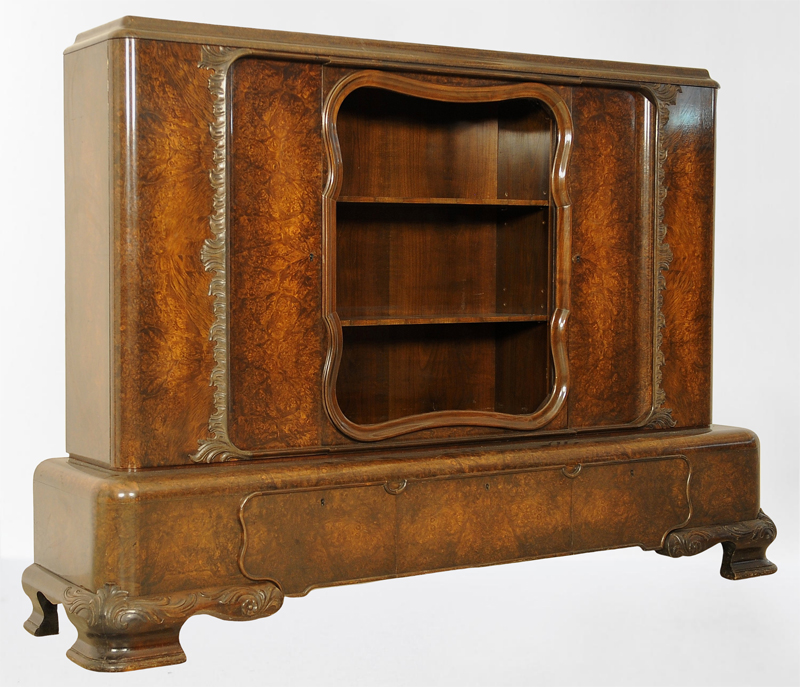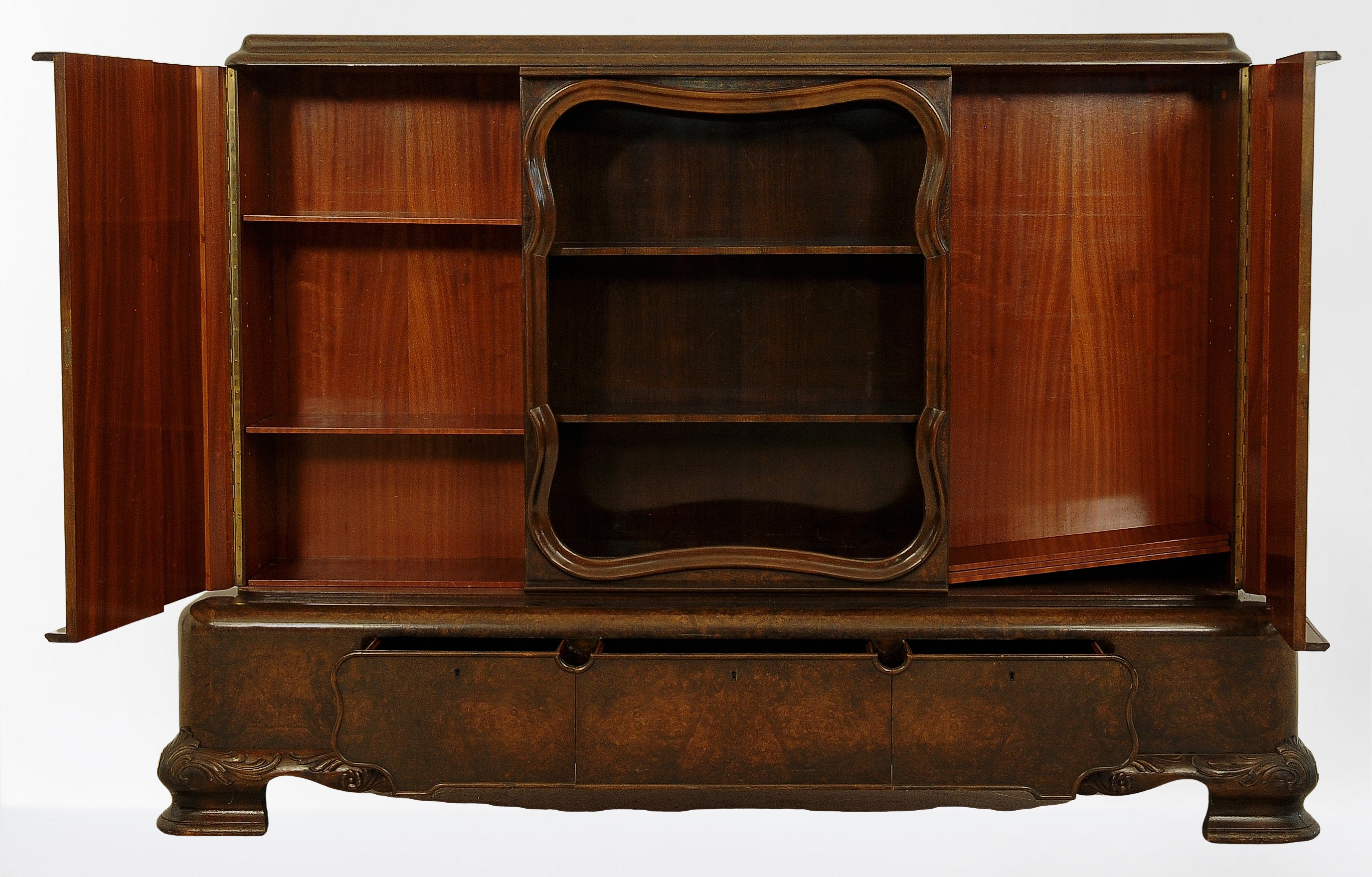 Besonders hervorzuheben sind die leicht geschwungenen Formen, die schönen Blattranken in den Türen, die mittige interessant eingerahmte Glasscheibe sowie das praktische Innenleben.