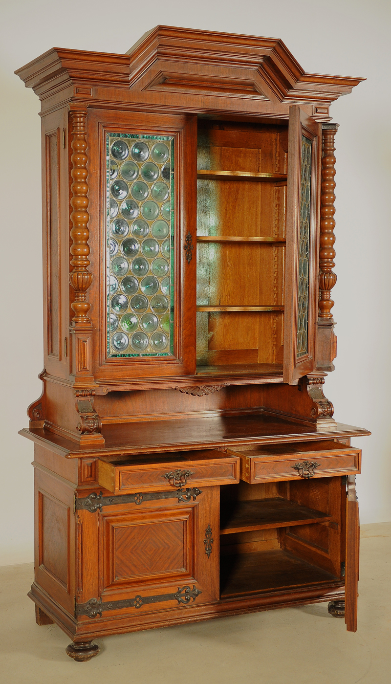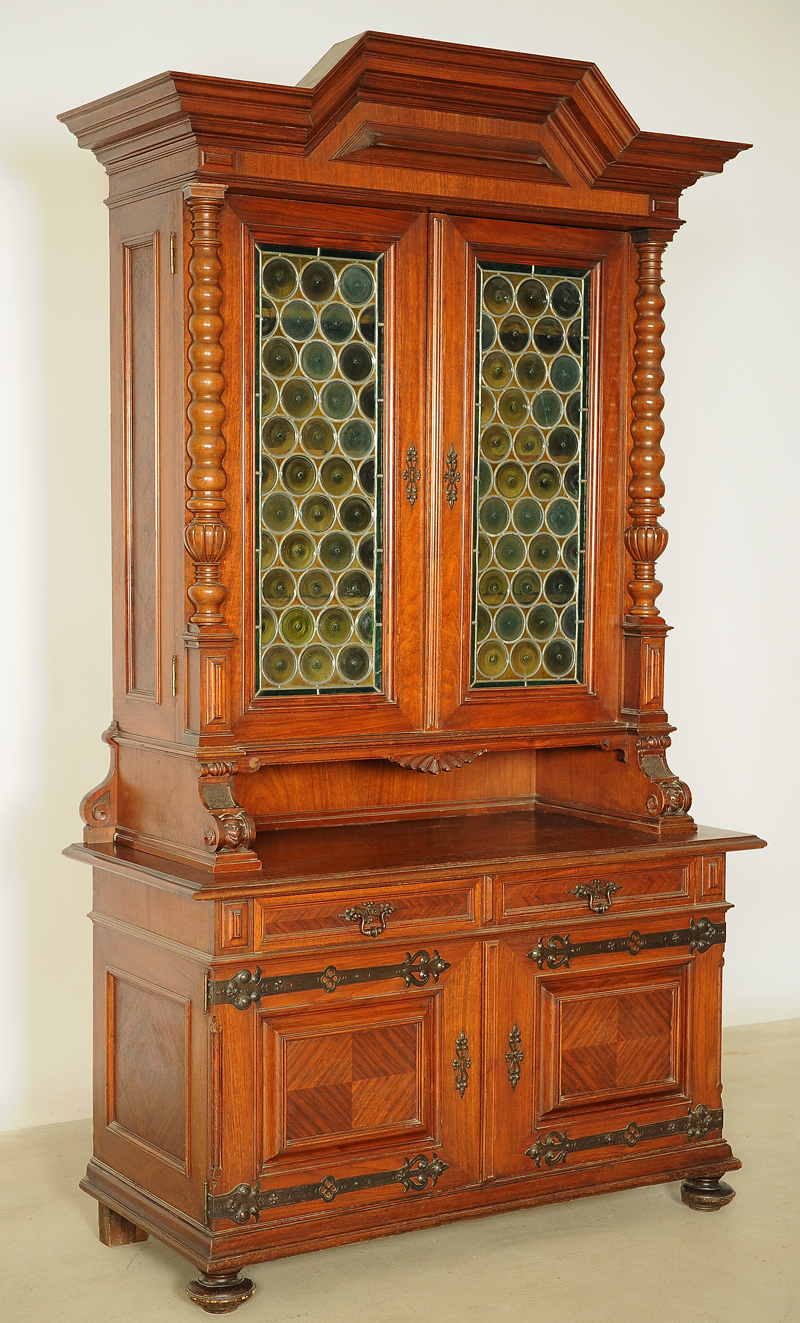 Das fulminante Dach, ausladend und mehrfach profiliert gestaltet, die eleganten gedrechselten Säulen mit kannelierten Pilastern, das hochinteressante Beschlagwerk, die feinen Butzenscheiben sind nur einige herausragende Beispiele für diesen schönen Schrank.