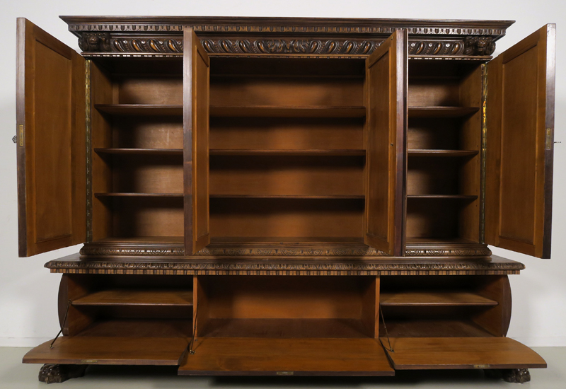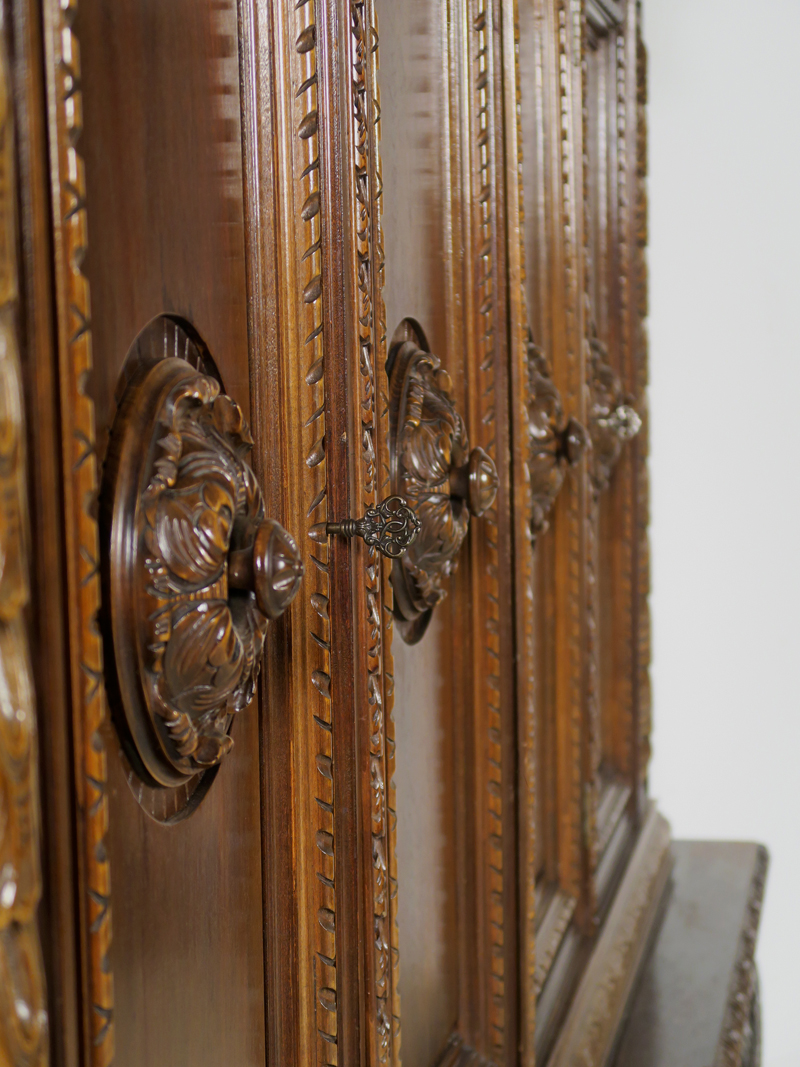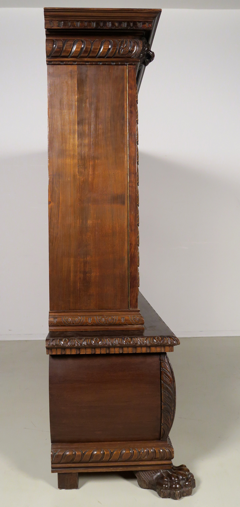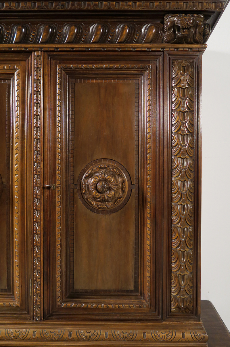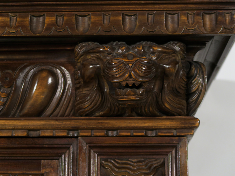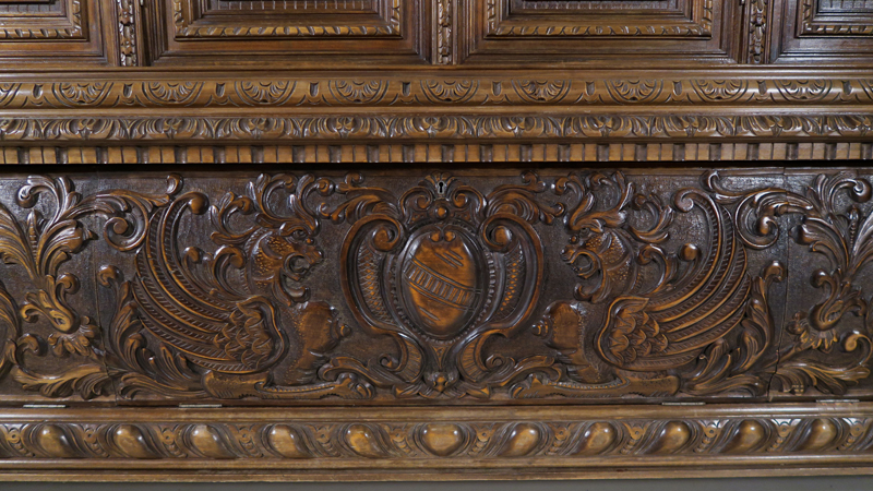 Besonders bemerkenswert sind die beiden seitlichen Pilaster die oberhalb zwei geschnitzte Löwenköpfe mit außerordentlicher Ausdrucksstärke zeigen. Zudem korrespondieren die fulminant herausgearbeiteten Zargen perfekt, sie zeigen unter anderem Fabelwesen wie geflügelte Drachen, Blattranken, Blüten und Blumen sowie Früchte. Der Bücherschrank besitzt vier Türen deren Füllung eine große geschnitzte Rosette besitzt. Komplementiert wird der Schrank durch massive Löwentatzenfüße.