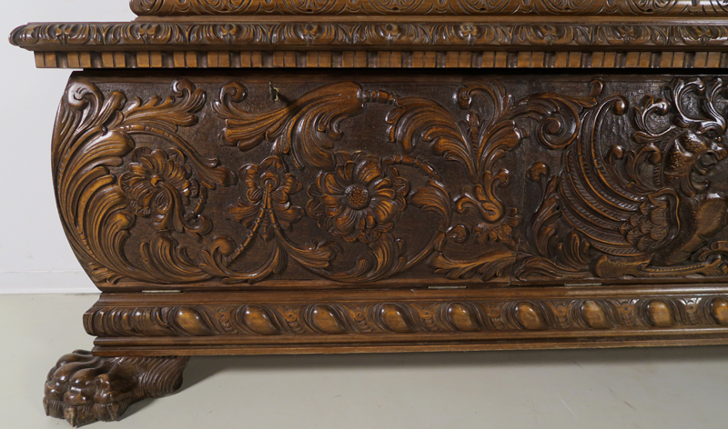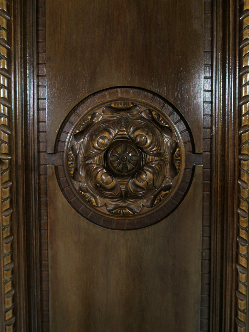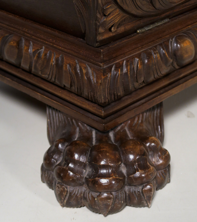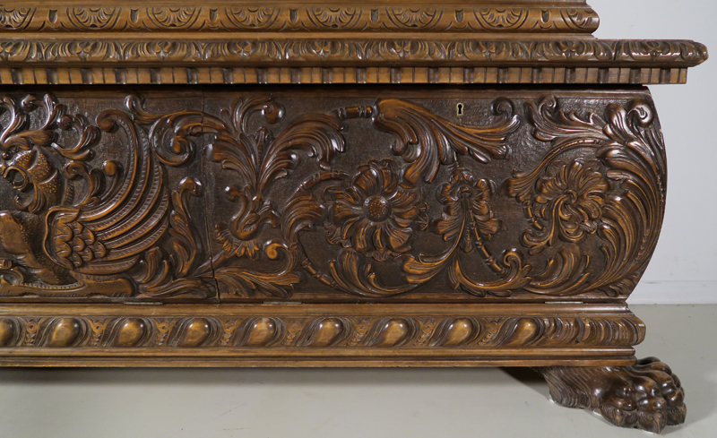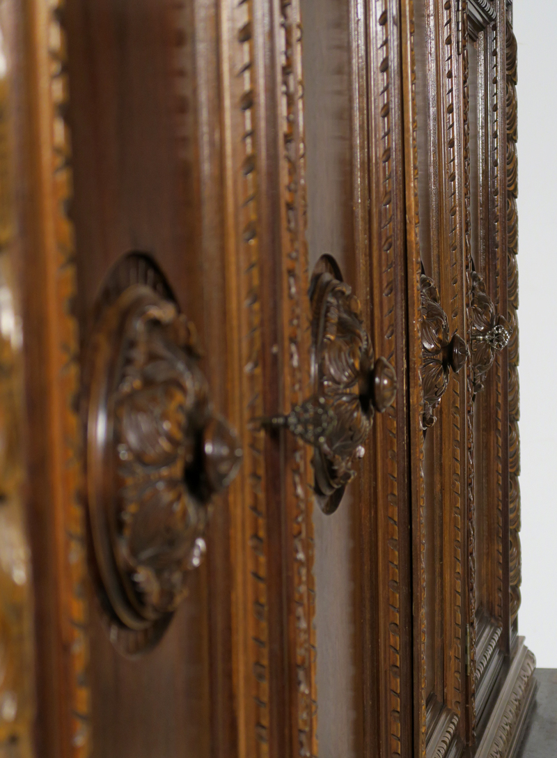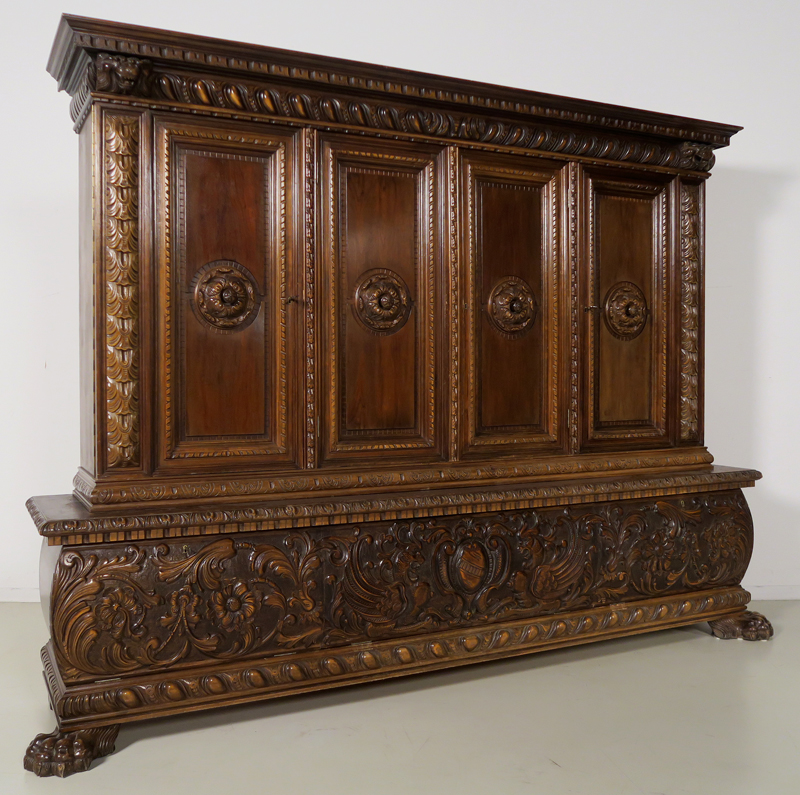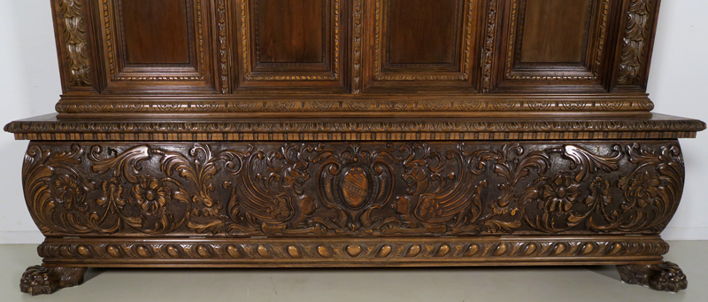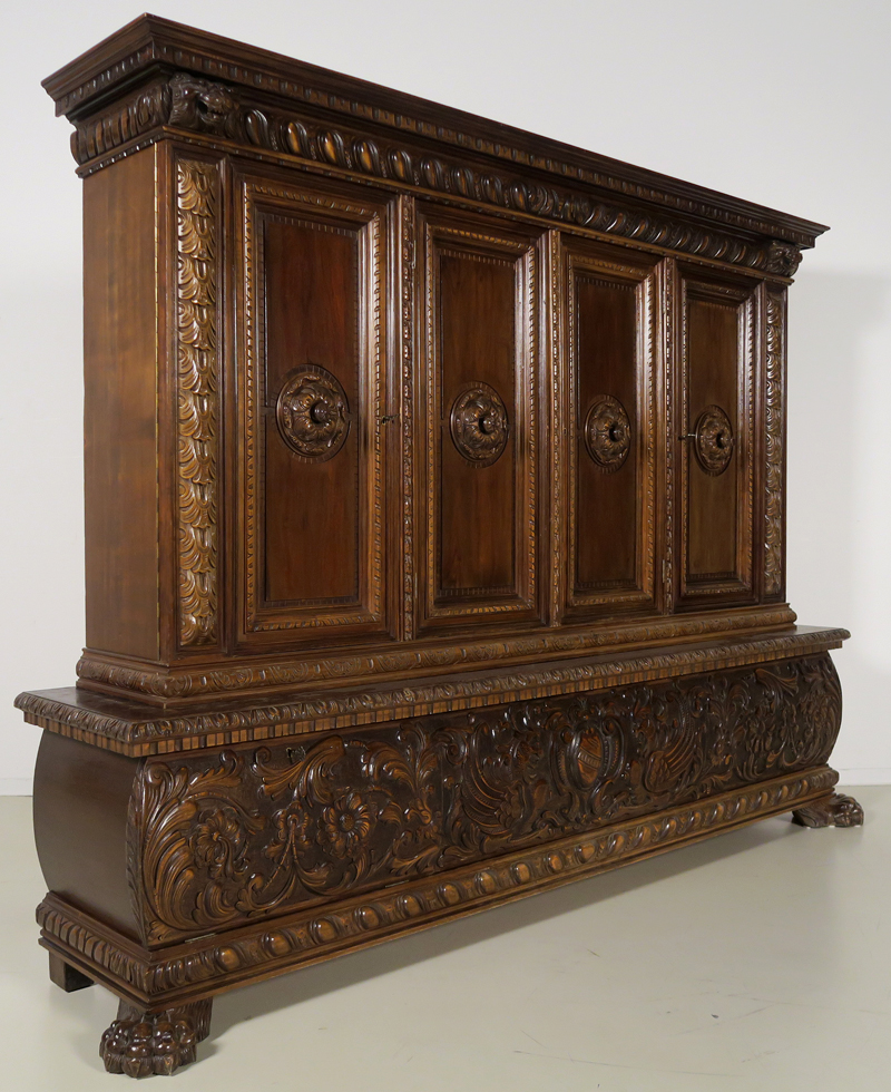 Besonders bemerkenswert sind die beiden seitlichen Pilaster die oberhalb zwei geschnitzte Löwenköpfe mit außerordentlicher Ausdrucksstärke zeigen. Zudem korrespondieren die fulminant herausgearbeiteten Zargen perfekt, sie zeigen unter anderem Fabelwesen wie geflügelte Drachen, Blattranken, Blüten und Blumen sowie Früchte. Der Bücherschrank besitzt vier Türen deren Füllung eine große geschnitzte Rosette besitzt. Komplementiert wird der Schrank durch massive Löwentatzenfüße.