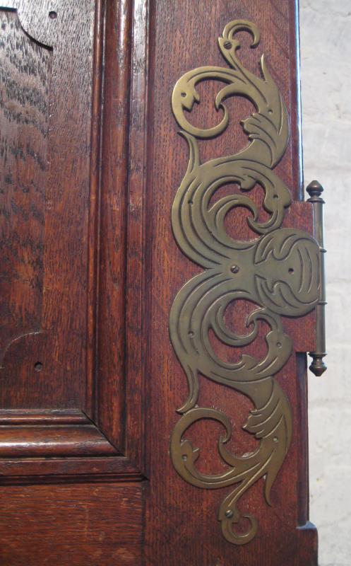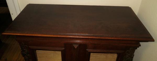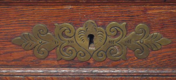 Bücherschrank aus der Gründerzeit gefertigt um die Jahrhundertwende. Er besticht neben seiner markanten Erscheinung besonders durch seine großzügigen Messingbeschläge.