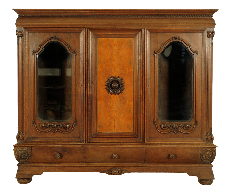 Die mittlere Tür mit ihrer großen Rosette beeindruckt durch ihr ausdrucksstarkes Furnierbild in schönster Maserung. Auch das außergewöhnliche, leicht auskragende Gesims mit zarter Bänderung fügt sich in den gelungenen Gesamteindruck gekonnt ein.