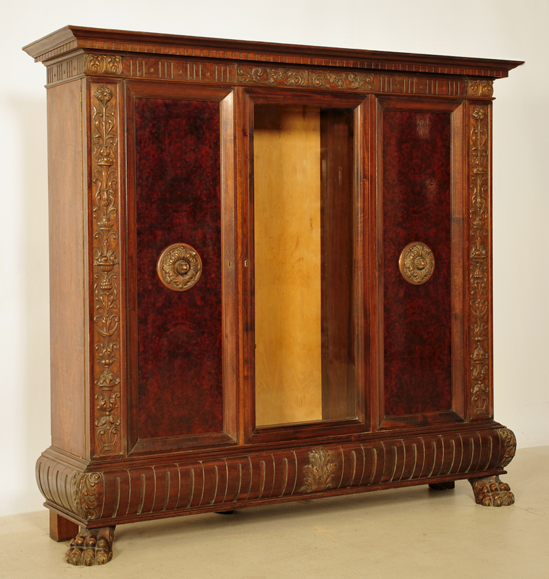 Besonders hervorzuheben sind die geschnitzten Zargen und Seiten, die girlandenartige Blattranken sowie Blüten und Früchte zeigen, die mittigen Rosetten der Türfüllungen, die schön eingefasste mittlere Glastür, die Einblick in das Innere des Schrankes gewährt und die schön herausgearbeiteten Tatzenfüße. Die Einlegeböden sind leider nicht vorhanden können aber nach Ihren Wünschen angefertigt werden.