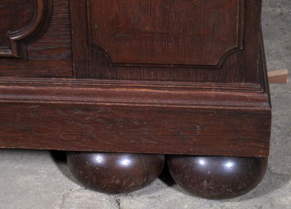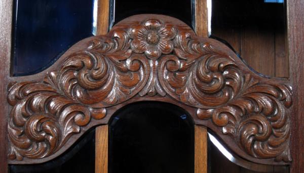 Besonders hervorzuheben sind die riesigen, breit kannelierten Pilaster mit leicht beschnitzten Kapitellen, die mit wunderschön floralen Motiven versehen Applikationen an den facettierten Glastüren, der in schöner Geometrie kassettierte Unterbau mit zwei großen, praktischen Schubläden sowie die doppelt angebrachten Kugelfüße. Auch die originalen Beschläge, die funktionale Aufteilung des Innenraumes und nicht zuletzt das stilvolle Furnierbild in schöner Maserung und warmem Farbton tragen zu dem herrschaftlichen Gesamteindruck des Schrankes bei.