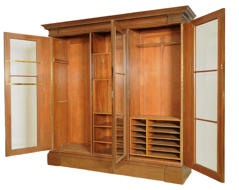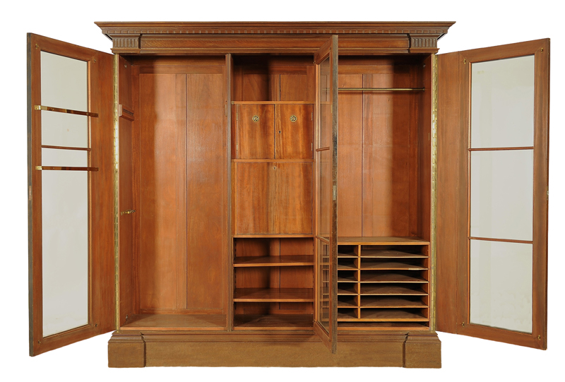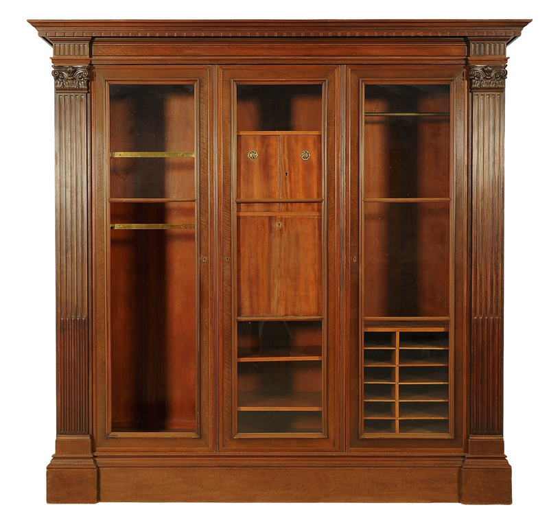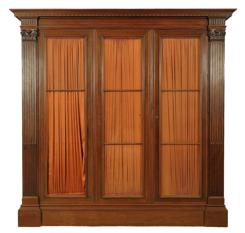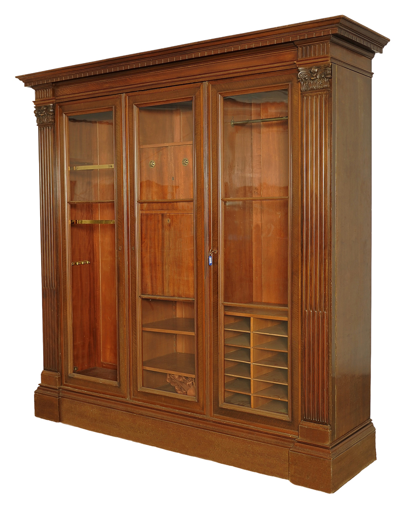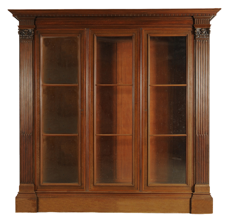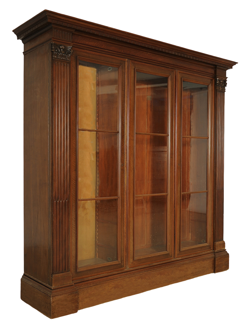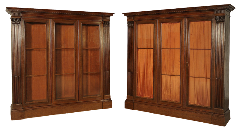 Die herausragende Präsenz dieser beiden Bücherschränke begründet sich in Ihrer großzügigen Ausmaße und der hochwertigen Verarbeitung. Hervorzuheben sind hier vor allem das auskragende, fein beschnitzte Gesims, die kannelierten Pilaster mit zauberhaft und meisterlich geschnitzten Kapitellen, die profilierten Kassettierungen der Glastüren sowie die kräfige Base. Die beiden Schränke warten auch durch ihr hochwertiges wie funktionales Innenleben auf. Gegenfurnierte Türen und Wände sowie mannigfaltige Ablagemöglichkeiten oder auch eine Garderobe sind hier zu finden. Als kleines Highlight wurde in einem der Schränke auch ein Wertfach eingefügt. Ihre erhabene Ausstrahlung machen sie zu einem stilvollen Blickfang jeder Einrichtung, durch ihre Größe und repräsentative Erscheinung eignen sie sich zudem auch beispielsweise als Einrichtung für Kanzleien oder ähnlichem.