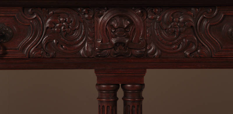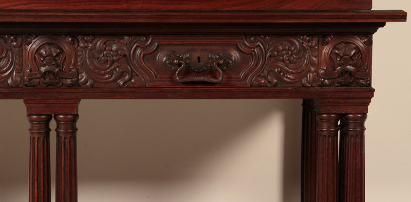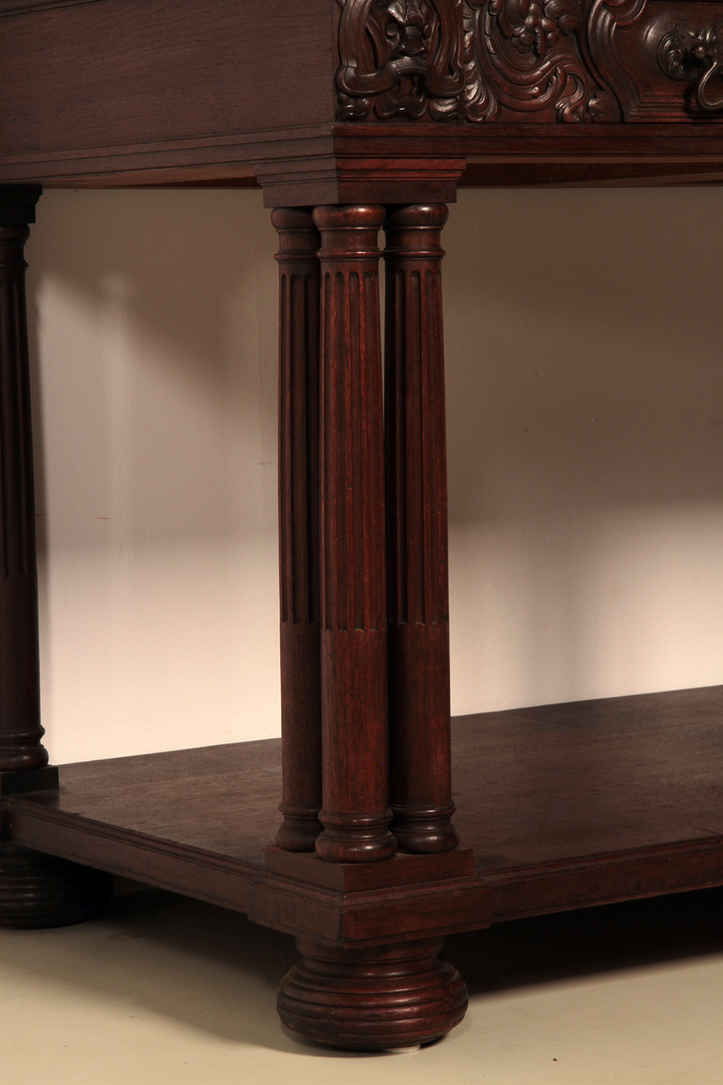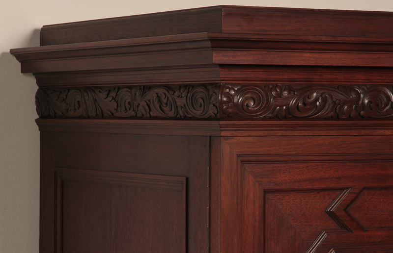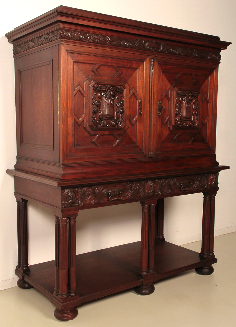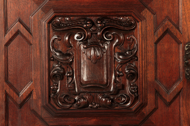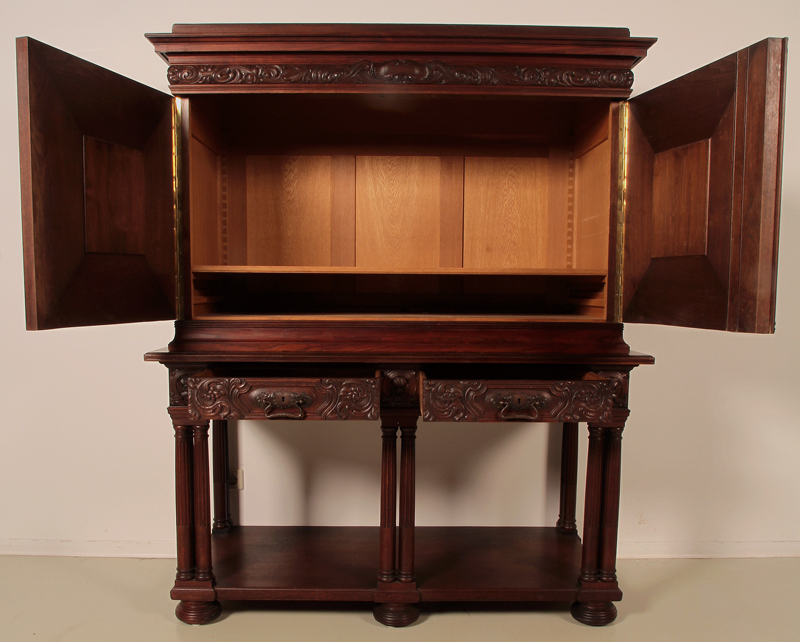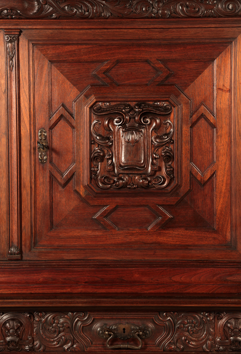 Hervorzuheben ist hierbei das allgegenwärtige Schnitzwerk, ausgeführt in größter künstlerischer Qualität, sowie die zwölf eleganten Säulen, die den Schrank tragen.