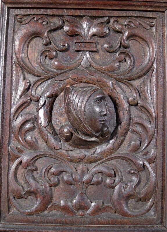 Besonders hervorzuheben sind natuerlich die filigranen Schnitzereien, die in den fantastischen Türfuellungen mit den zwei zugewandten männlichen Köpfen gipfeln. Sie werden von verschlungenen Blattranken und mystisch stilisierten Drachen umrahmt. Die Pilaster sowie die oberen und unteren Zargen sind ebenfalls meisterlich gestaltet. Es wurden plastische florale Motive wie Blüten und Blätter, amphorenartige Vasen und fratzenhafte Gesichter als verwendet.