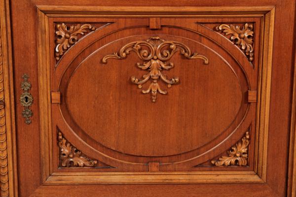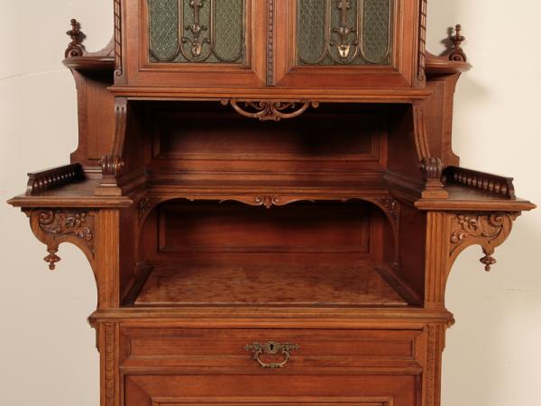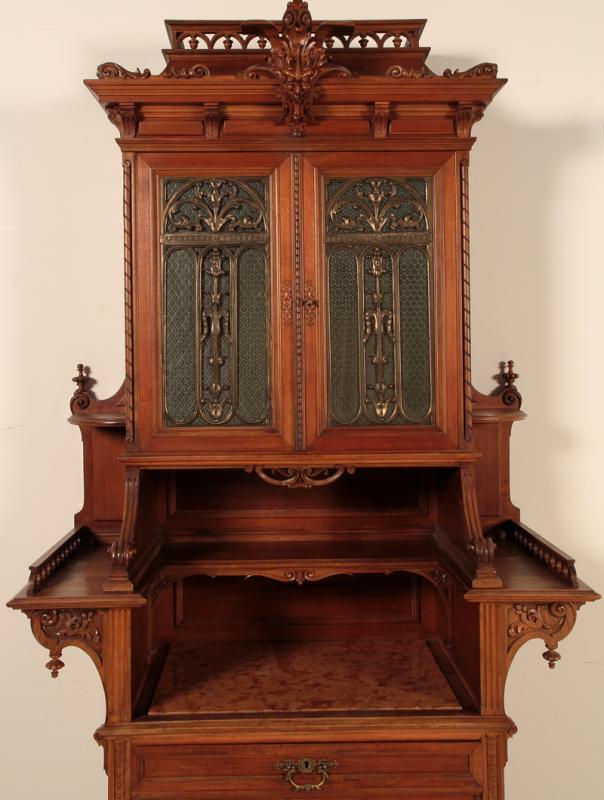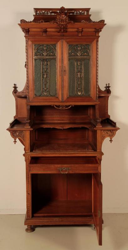 Aus bestem Nussbaum um 1900 gefertigt besticht es unter anderem durch seine geschnitzte Vorderfront, den tollen Butzenscheiben im Aufsatz, der Balustradenbekrönung mit geschnitzter Freske, den profilierten Leisten, den interessanten Kapitellen unterhalb des Dachgesims, den umlaufenden Galerien, der Marmorplatte sowie den abschließenen Kugelfüßen.
