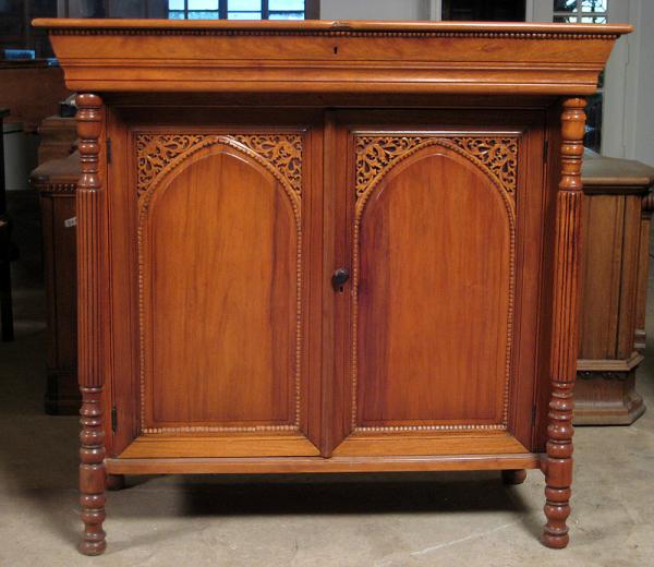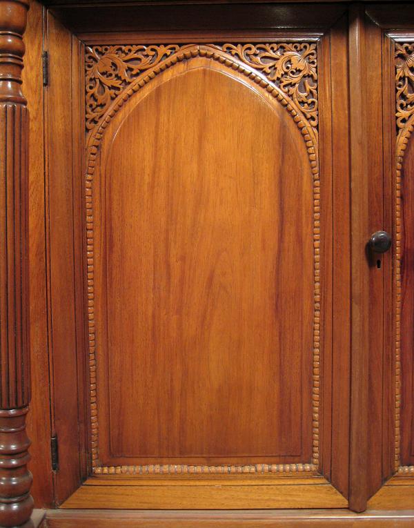 Besonders hervorzuheben sind natürlich die beiden großen Türen mit leicht spitz zulaufenden Rundbögen. Die ausgesparten Ecken wurden mit filigranster Schnitzerei versehen, die sich wunderbar in die Philosophie des Möbels einfügt. Weitere Merkmale sind die beiden kannelierten und aufwändig gedrechselten Säulen an den Seiten, die große Schublade direkt unter der Deckplatte mit feinen Profilierungen sowie das praktische Innenleben mit einem Einlegeboden und zwei Schubladen.