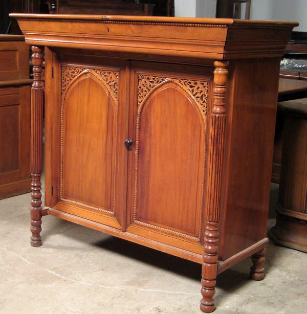 Heute können wir Ihnen wieder einmal ein Schmucksück epochaler Tischlerkunst anbieten. Es handelt sich dabei um einen kleinen Kabinettschrank, gefertigt um 1880 aus massivem Nussbaum, der der Stilepoche des Historismus zuzuschreiben ist. Auffällig sind seine deutlichen Bezüge zur Gotik, die das Möbel ungemein interessant machen. Ebenso begeistern seine elegante Linienführung und die herrausragende Qualität!