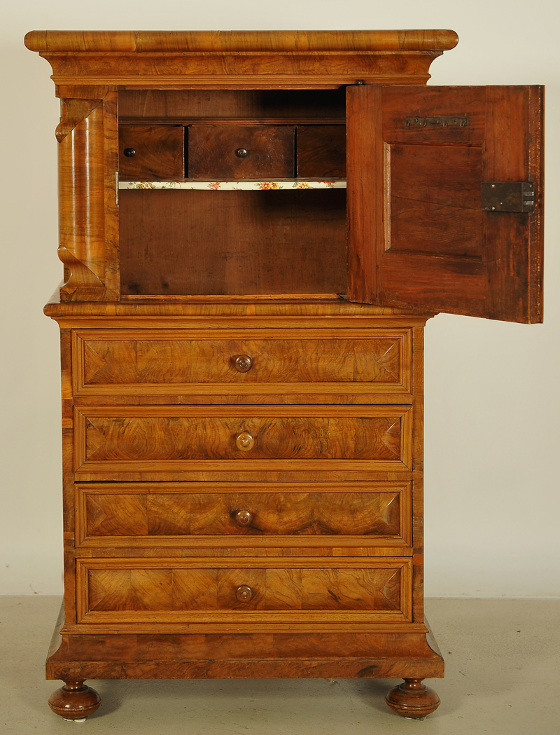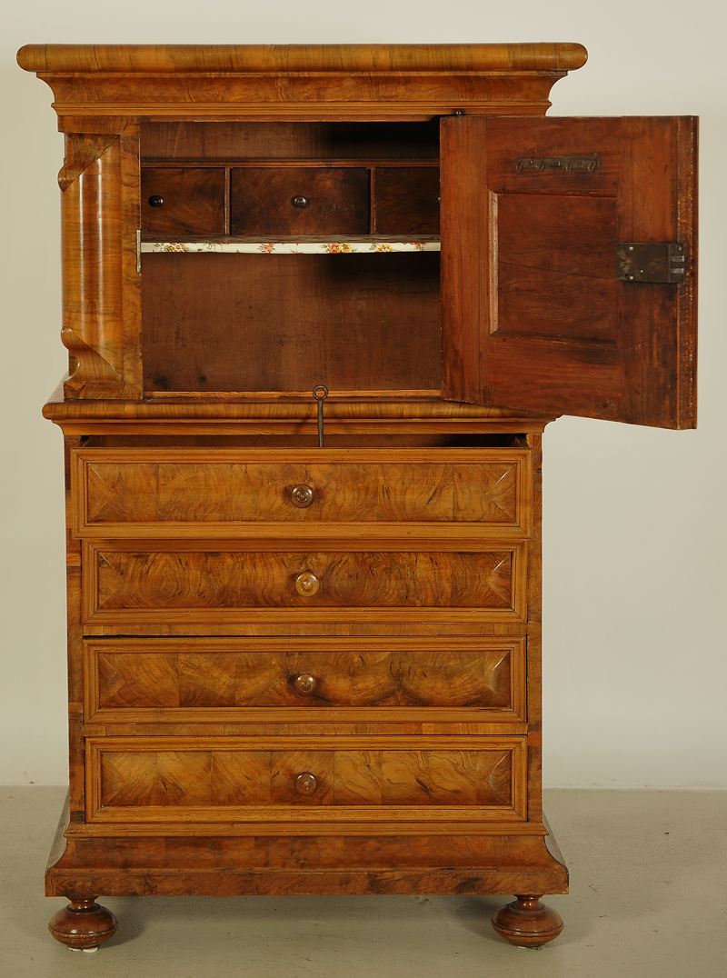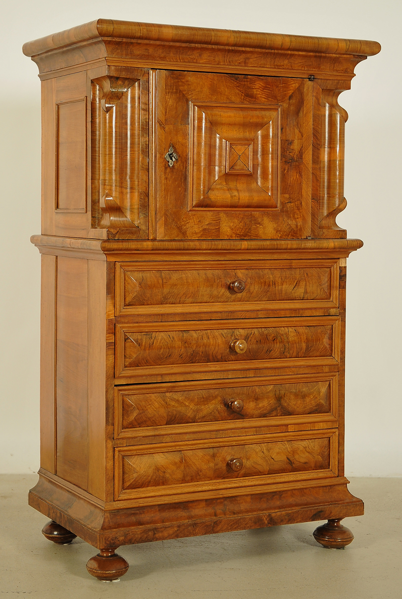 Dieses wunderschöne Exponat begeistert durch seinen eleganten Aufbau mit vier Schubladen und einem schönen Fach im oberen Bereich mit drei kleinen Kästchen. Die typischen Ecknasen, die Aneinanderreihung von Wulst und Kehle (Wellen) welche eine sehr interessante Wechselwirkung aus Licht und Schatten erzeugen, die kassettierten Seitenwände, sowie das alte originale Beschlag- und Schließwerk sorgen für eine wunderschöne Optik des Schrankes.