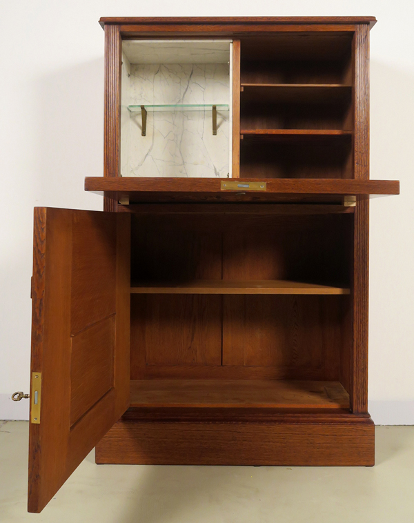 Hier bieten wir Ihnen einen fantastischen Barschrank aus dem Jugendstil an, gefertigt aus schönem Eichenholz, massiv und furniert. Sein Fassadenstil mit zwei figürlichen Reliefs zeigen einem Vorgel und ein Eichhörnchen und belegen seine epochale Zugehörigkeit.