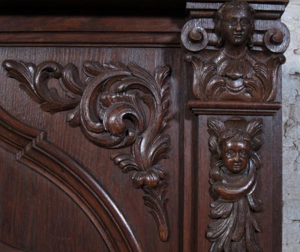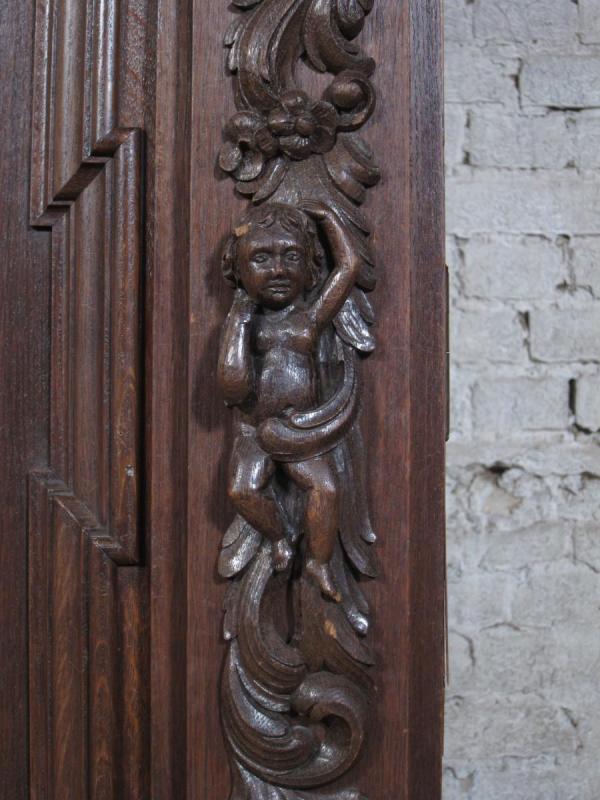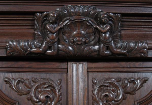 Sein verkröpftes, profiliertes Gesims wird von einer von zwei Engelsfiguren umrahmten Muschelkrone geziert, eine ähnliche Symbolik findet sich in den beiden Pilastern mit fulminanten, geschneckten Kapitellen und hübscher floraler Ornamentik. Herausragend gestaltet sind auch die Türen mit ihren profilierten Kassettierungen in interessanter Geometrie und ihrem unvergleichlichen Schnitzwerk mit plastischen Engelsköpfen.