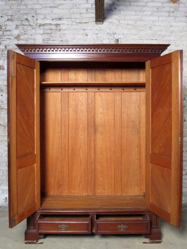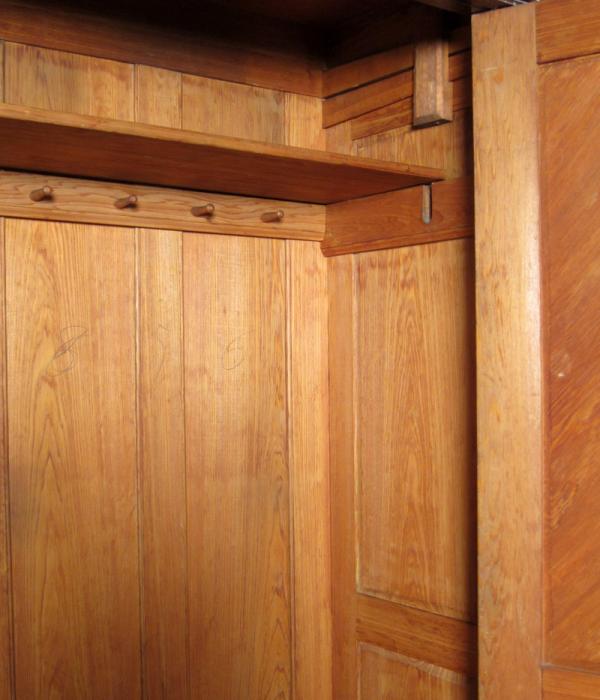 Zu seinen besonderen Merkmalen gehört das profilierte, leicht ausladende Dach, die komplette Kassettierung, die auffallenden kanelierten Pilaster, die beiden Schubladen in der unteren Zarge, das praktische Innenleben mit Kleiderstange, Garderobe und darüberliegender Hutablage sowie die schönen Originalbeschläge.