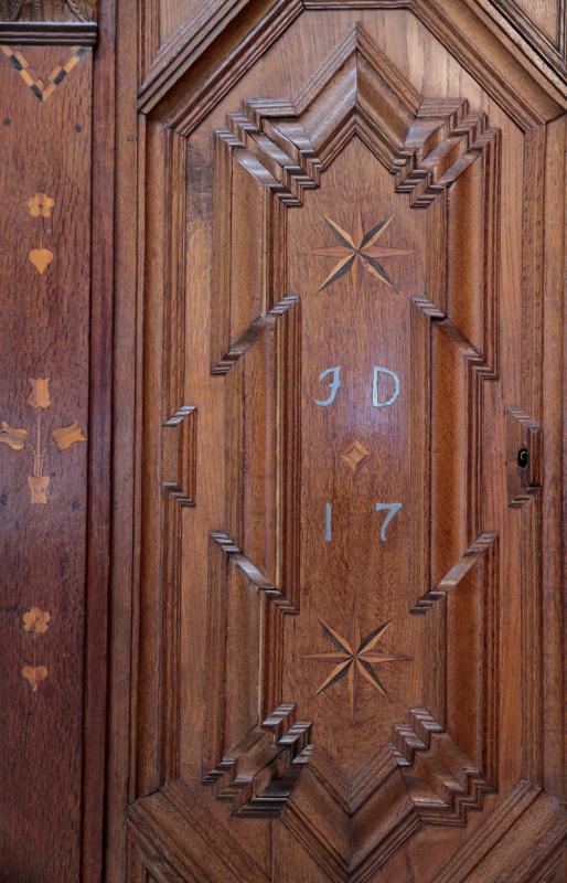 Tiefe Kassettierungen, mehrfach profiliert und in feiner Geometrie interessant angeordnet geben dem Schrank sein charakteristisches Aussehen. Hierzu kommen noch das vielfach profilierte und abgetreppte Dach und die typischen Kugelfüße. Highlight sind darüber hinaus die wundervoll geschnitzten Kapitelle der Pilaster und der mittigen Schlagleiste sowie die darunterliegenden zauberhfaften Furnierarbeiten mit zarten floralen Motiven.