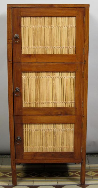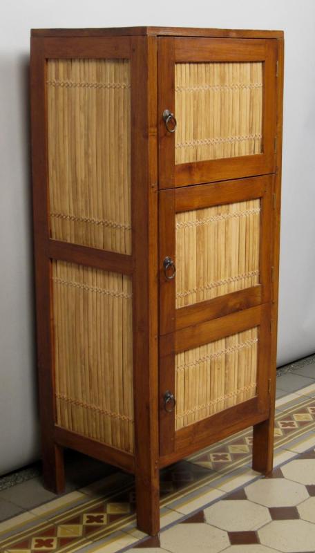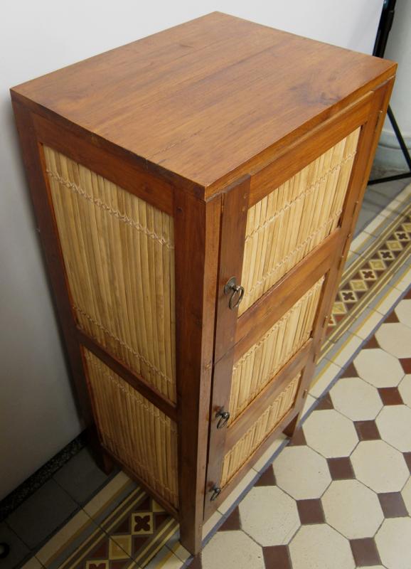 Der kubische Korpus besteht aus hochwertigem, massivem Teak-Holz, die Füllungen der drei kleinen Türen und der Seiten bestehen aus Bambusholz. Durch die unterschiedlichen Farbtöne der Hölzer entsteht ein sehr angenehmer und für diese Art Möbel typischer Kontrast. Abgerundet wird die in sich stimmige Erscheinung durch das schöne Beschlagwerk.