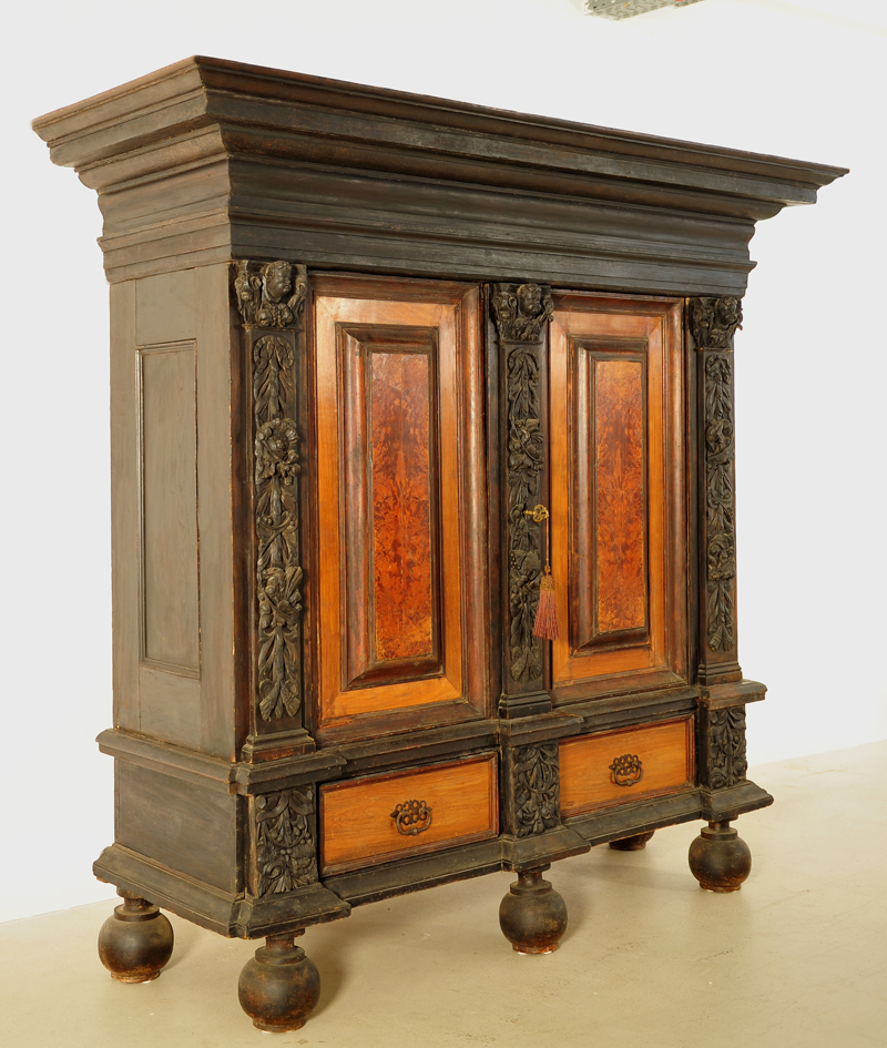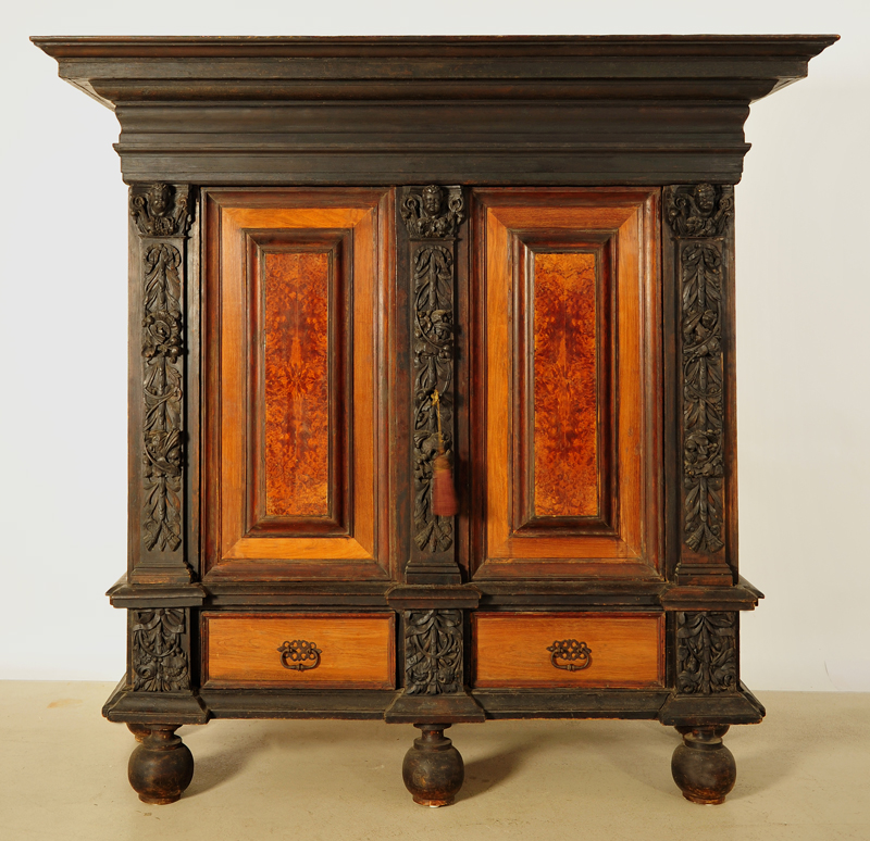 Der zweitürige Korpus wartet mit einem so reichem wie filigranem Schnitzwerk auf, das dabei fulminant in der herrschaftliche Architektur zur Geltung kommt. Der Korpus wurde aus Eiche gefertigt, die Füllungen bestehen aus Nussbaum. Herausragend ist das mächtige, abgetreppte Dachgesims, die drei Puttenköpfe in den Kapitelen sowie zwei Schubfächer. Die imposante Erscheinung ruht auf grandiosen Kugelfüßen.