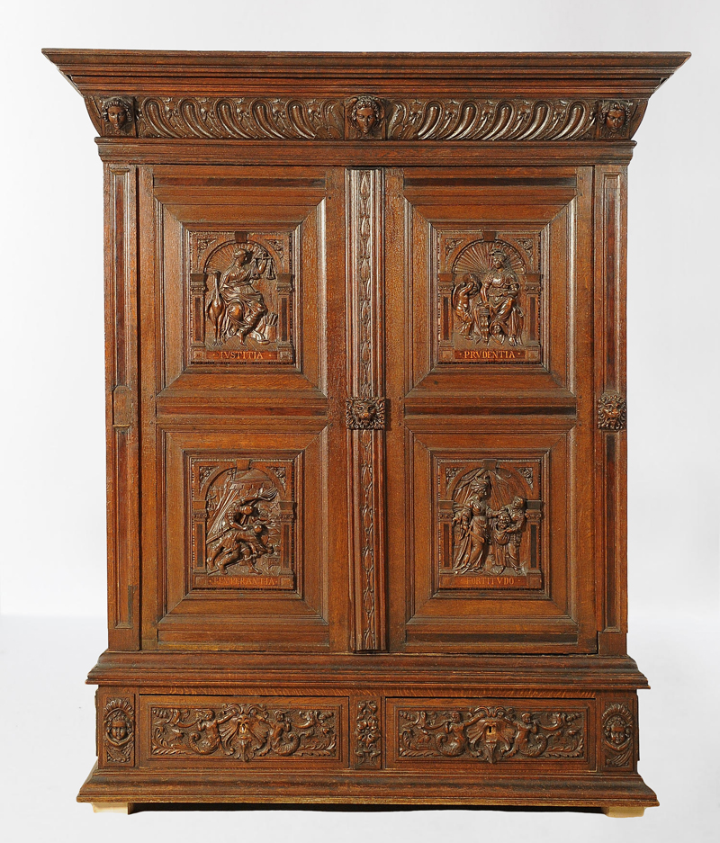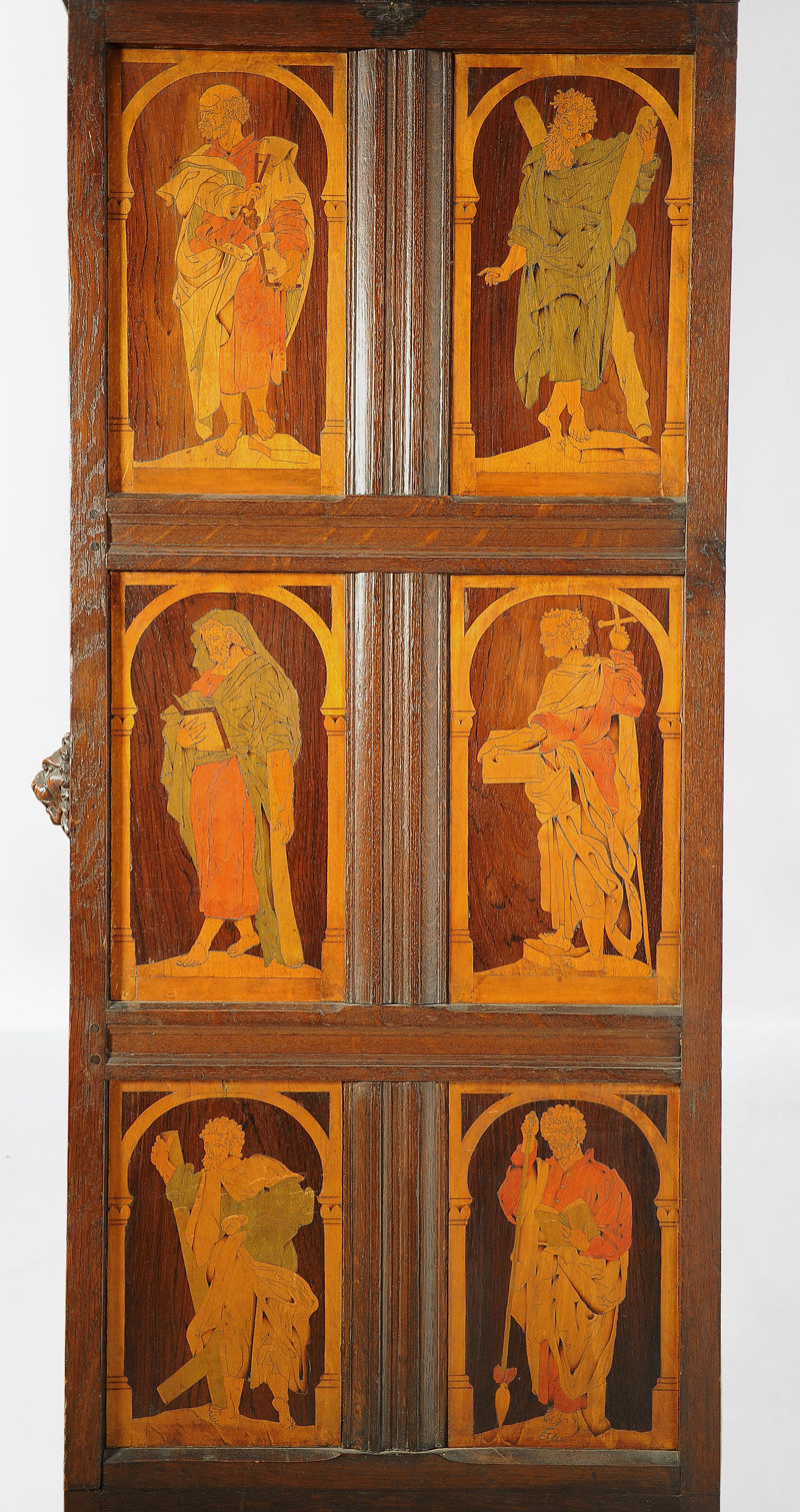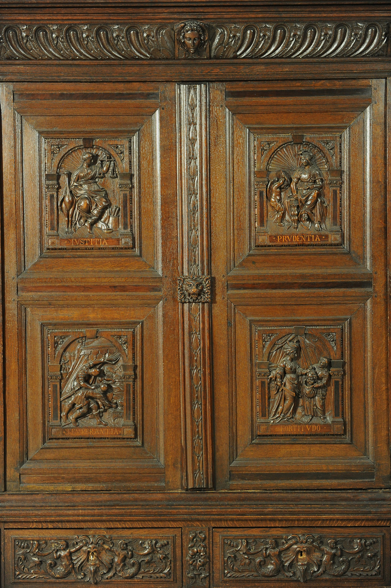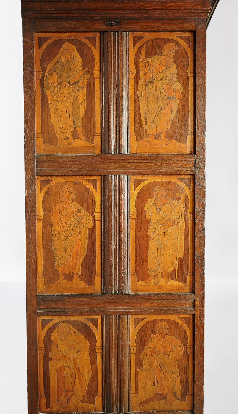 Seine fantastische Gestaltung gipfelt in der meisterlichen Darstellung der 12 Apostel an den Seitenfronten sowie den vier sagenhaften Reliefs in der Front, die die vier Kardinaltugenden nach Platon anschaulich in Szene setzen. Dabei wurden diese von den Römern bezeichnet als Fortitudo (Tapferkeit), Iustitia (Gerechtigkeit), Temperantia (Mäßigung) und Prudentia, die Klugheit. Die Reliefs bestehen aus handgeschitzten Figuren sowie umrahhmender Muschelkrone. Die Apostel sind aus verschiedenen Obsthölzern kunstvoll und detailreich intarsiert.
