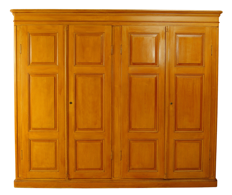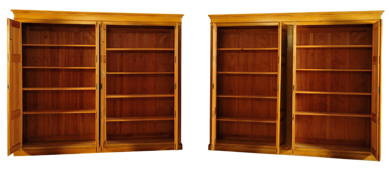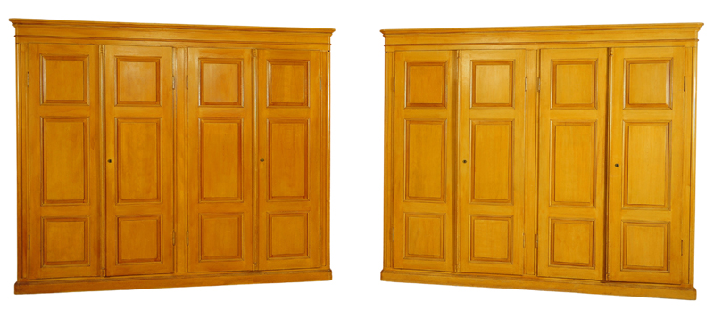 Die Schränke sind jeweils mit vier Türen ausgestattet. Diese werden mit 12 Kassetten charakteristisch gegliedert, woebei auch die Seiten Kassettierungen beinhalten. Das leicht auskragende Dach bildet mit der unteren Zarge eine Flucht, wodurch ein sehr homogenes Bild herbeigeführt wird. Das Innenleben ist mit Einlegböden ausgestattet und bietet so eine funktionale Verwendung dieser formschönen Raritäten.