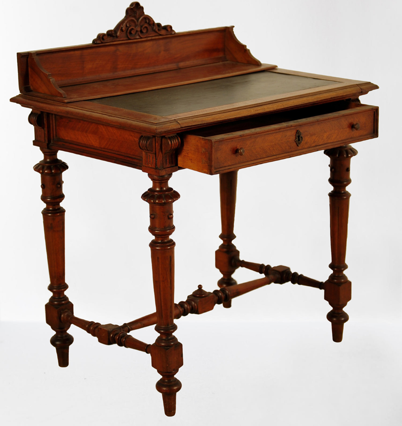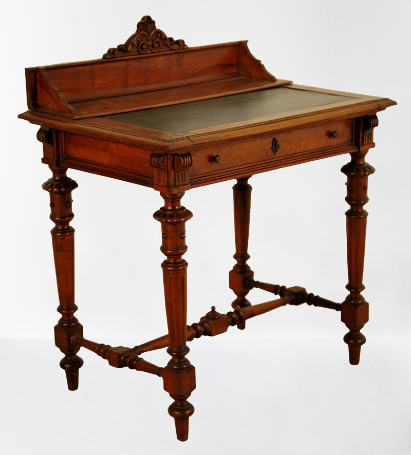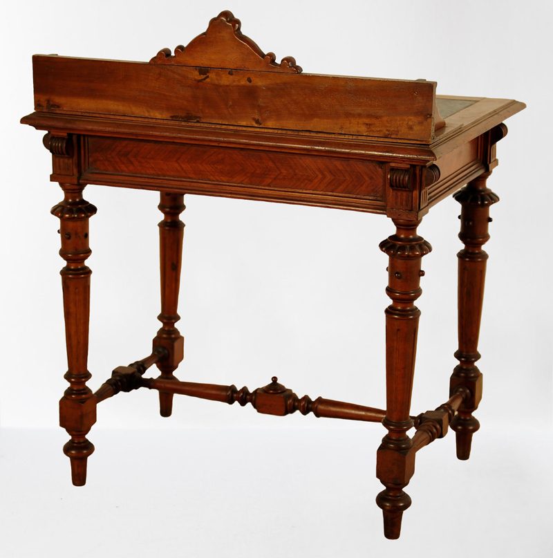 Hier haben wir ein ganz faszinierenden Damenschreibtisch im Angebot. Dieses traumhafte Exponat aus der repräsentativen Gründerzeit-Epoche begeistert durch seine einmalige architektonische Ausführung in allerfeinster Qualität. Er wurde um die Jahrhundertwende aus bestem Nussbaum, massiv und furniert, gefertigt.