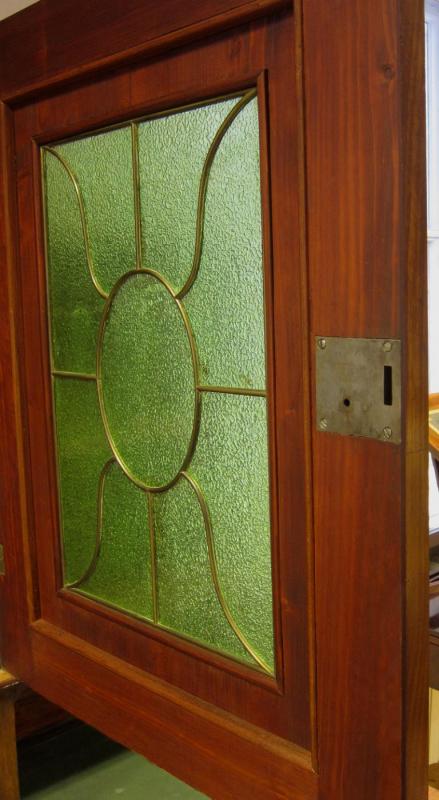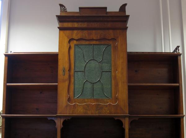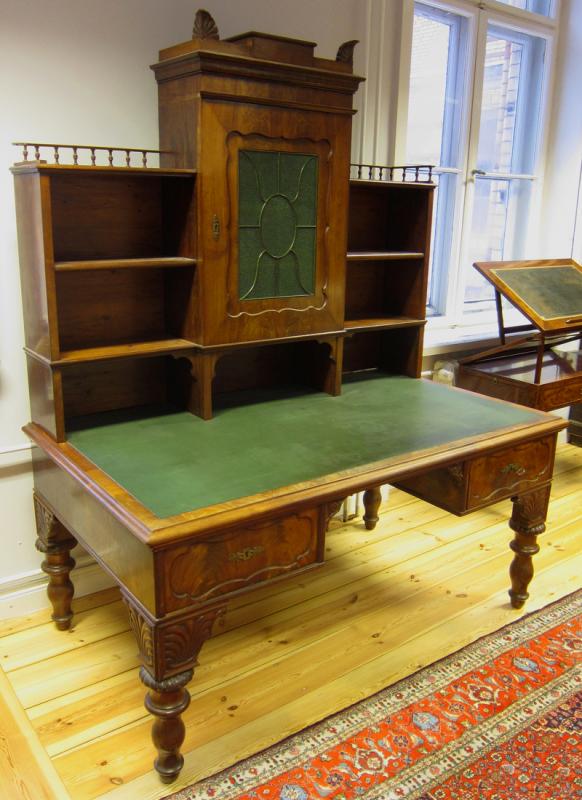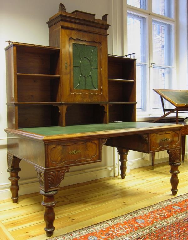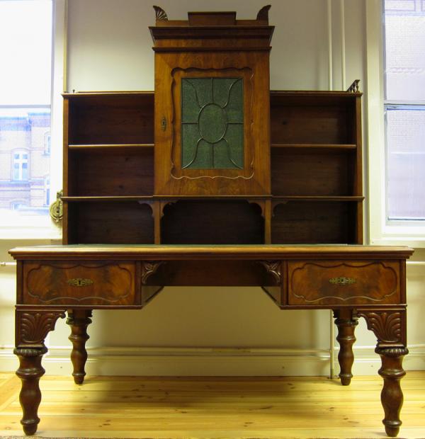 Besonders hervorzuheben sind der große Aufsatz mit dominierendem Turm in der Mitte, der sich durch sein aufwändiges Dach und der traumhaft schön eingefassten Tür ausszeichnet, die umlaufende Balustrade sowie die den Turm einrahmenden Etageren. Die breite Deckplatte mit grünem Einsatz wird von vier aufwändig gestalteten Beinen getragen, die neben ihrer ästhetischen Formgebung auch eine hohe Beinfreiheit garantieren. Diese wird auch nicht durch die beiden Schubläden beeinträchtigt, die sich, das hübsche Furnierbild betonend, stilvoll in die Gesamtposition einfügen.