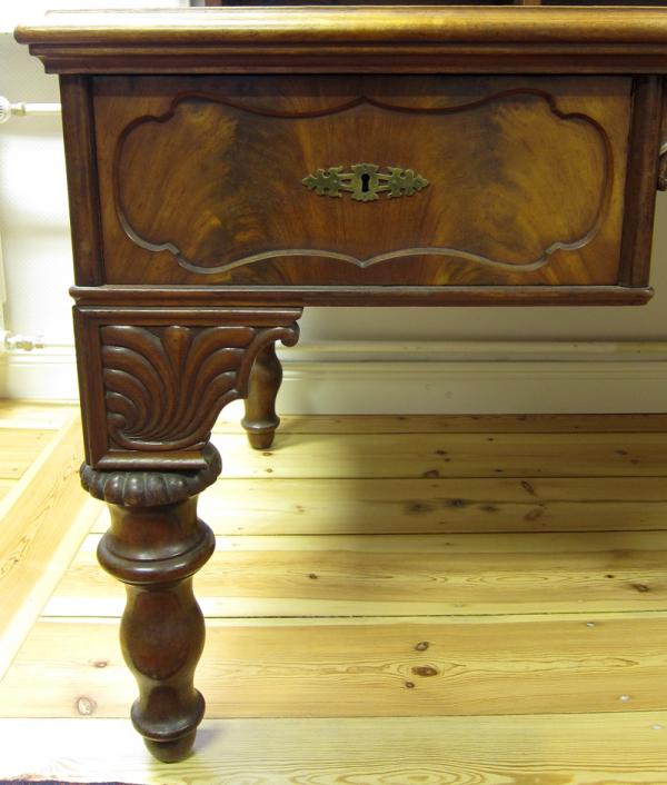 Der Schreibtisch ist in einem guten Originalzustand mit entsprechenden altersbedingten Gebrauchsspuren. Laut dem Vorbesitzer stammt er aus dem Privatbesitz Otto von Bismarcks, wir können Ihnen die Richtigkeit dieser Aussage jedoch leider nicht garantieren. Zweifelsohne hätte dieses Exponat durch seine Qualität und repräsentative Ausstrahlung auch diesem Staatsmanne zur Ehre gereicht.