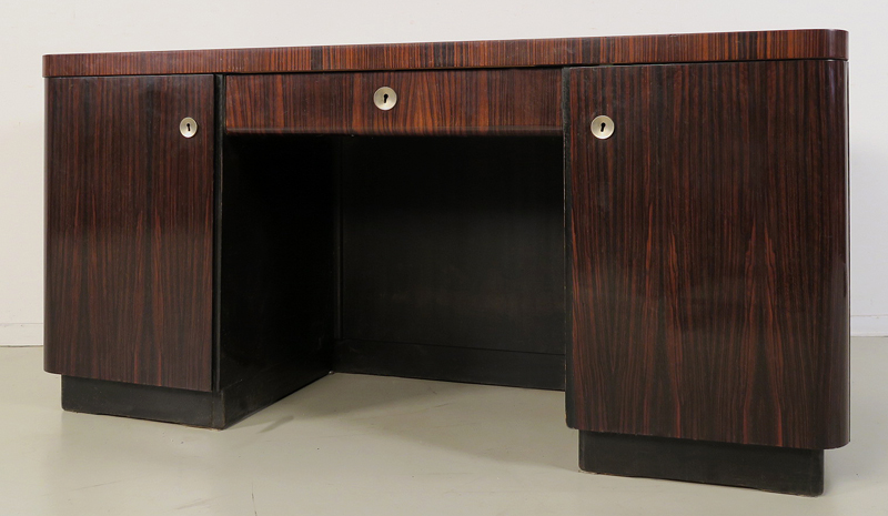 Hier können wir Ihnen einen eindrucksvollen Schreibtisch aus der Art Deko-/Bauhausepoche anbieten. Dieses Stück wurde um 1920 aus bestem Makassar, massiv und furniert, gefertigt und begeistert durch seine stilvolle, moderne Architektur und puristische Eleganz. Es betont die schlichte deutsche Sachlichkeit der goldenen 20er Jahre und ist Zeugnis des Wendepunkts der epochalen Stilrichtung.