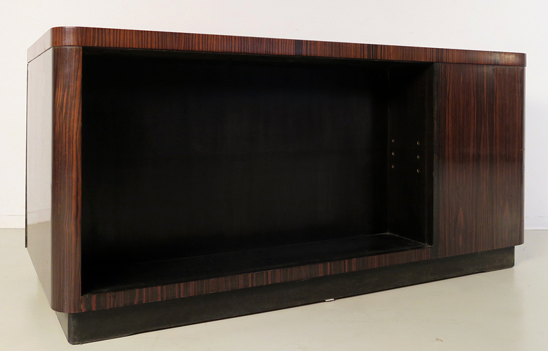 Besonders auffallend ist das unglaubliche Furnierbild, die zwei verschiedenen Farbtöne unterschiedlicher Intensität kontrastieren auf unvergleichliche Weise. Die Fertigung des Tisches als Freisteher erlaubt eine äußerst flexible Aufstellung im Raum, an der Rückseite befindet sich ein praktischer Regaleinbau, in den repräsentativ Bücher oder kleine Kunstwerke platziert werden können. Eine nach unten weg gerundete Schublade sowie die beiden Türen mit Schüben oder Einlegeböden an der Vorderseite unterstreichen die Verschmelzung von Eleganz und Funktionalität.