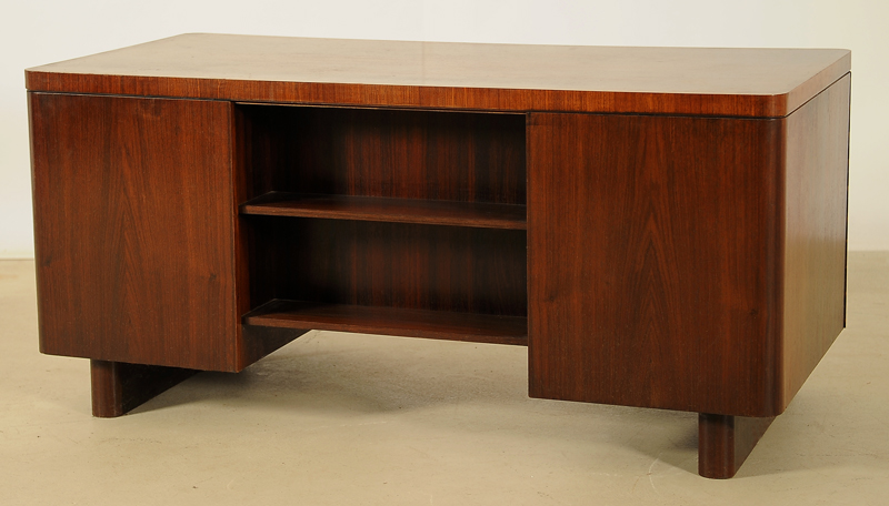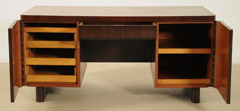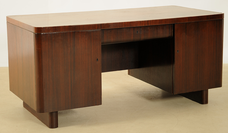 Hier präsentieren wir Ihnen einen formvollendeten Palisander-Schreibtisch aus der stilvollen Art Deco-Epoche. Um 1920 gefertigt überzeugt dieses Möbel in seiner eleganten, formberuhigten Ausführung und einhergehenden Präsenz.