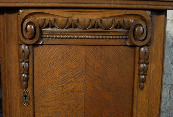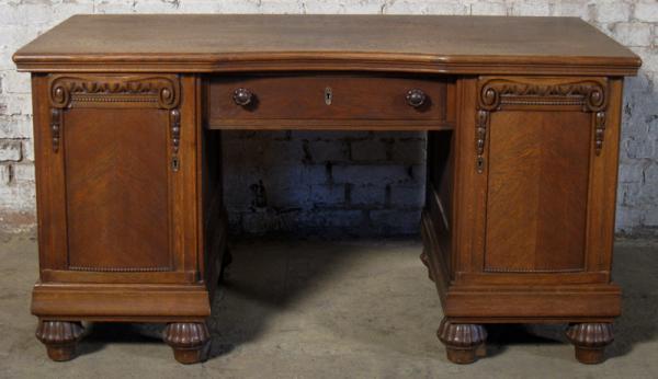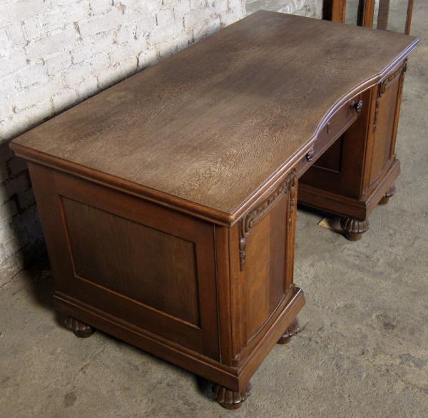 Hier bieten wir Ihnen einen beeindruckenden Schreibtisch aus der Gründerzeit an. Er wurde um die Jahrhundertwende in Berlin aus bester Eiche, massiv und furniert, gefertigt. Seine geradlinige Ausführung wird dabei von hübschen Details ergänzt und ruft eine äußerst präsente Ausstrahlung hervor.